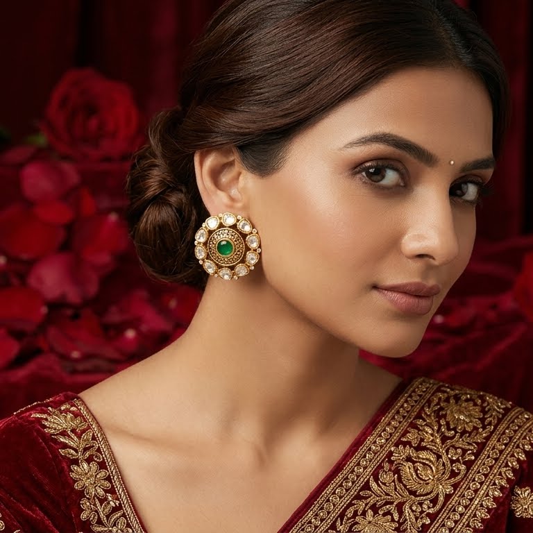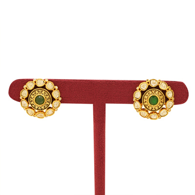 DESCRIPTION - THESE ANTIQUE-STYLE ROUND KUNDAN STUD EARRINGS. CRAFTED IN A RICH GOLD-TONE FINISH, THESE EARRINGS FEATURE A STRIKING EMERALD-GREEN CENTER STONE, SURROUNDED BY INTRICATE ANTIQUE DETAILING AND SPARKLING WHITE KUNDAN STONES ARRANGED IN A CLASSIC CIRCULAR PATTERN.PERFECT FOR WEDDINGS, FESTIVE OCCASIONS, POOJA CEREMONIES, AND TRADITIONAL EVENTS, THESE STUDS PAIR BEAUTIFULLY WITH SILK SAREES, LEHENGAS, AND ETHNIC SUITS. LIGHTWEIGHT YET REGAL, THEY OFFER TIMELESS ELEGANCE WITH EVERY WEAR.