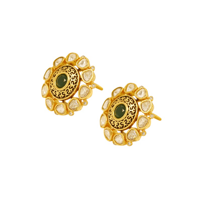 Antique Gold-Tone Green Kundan Round Stud Earrings
