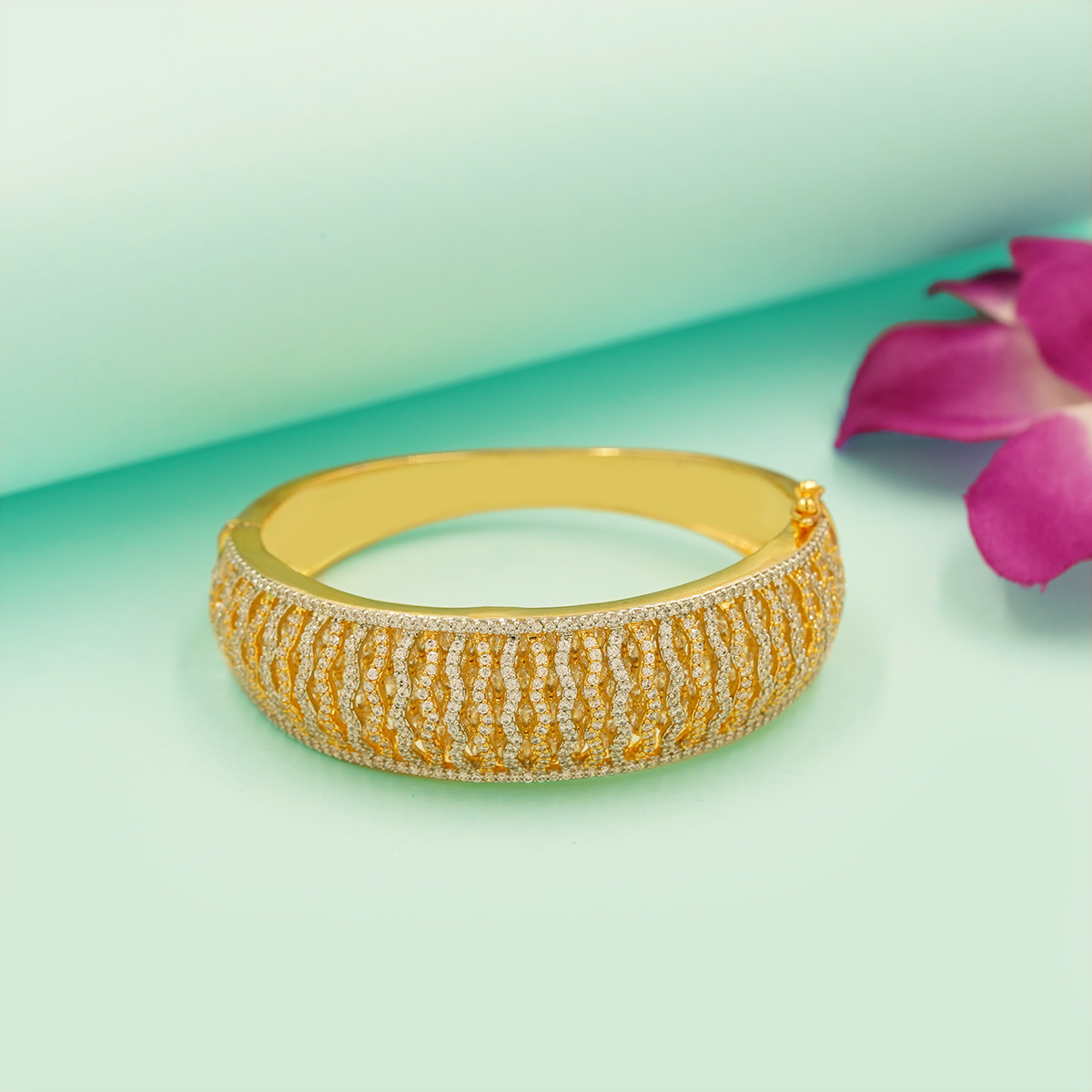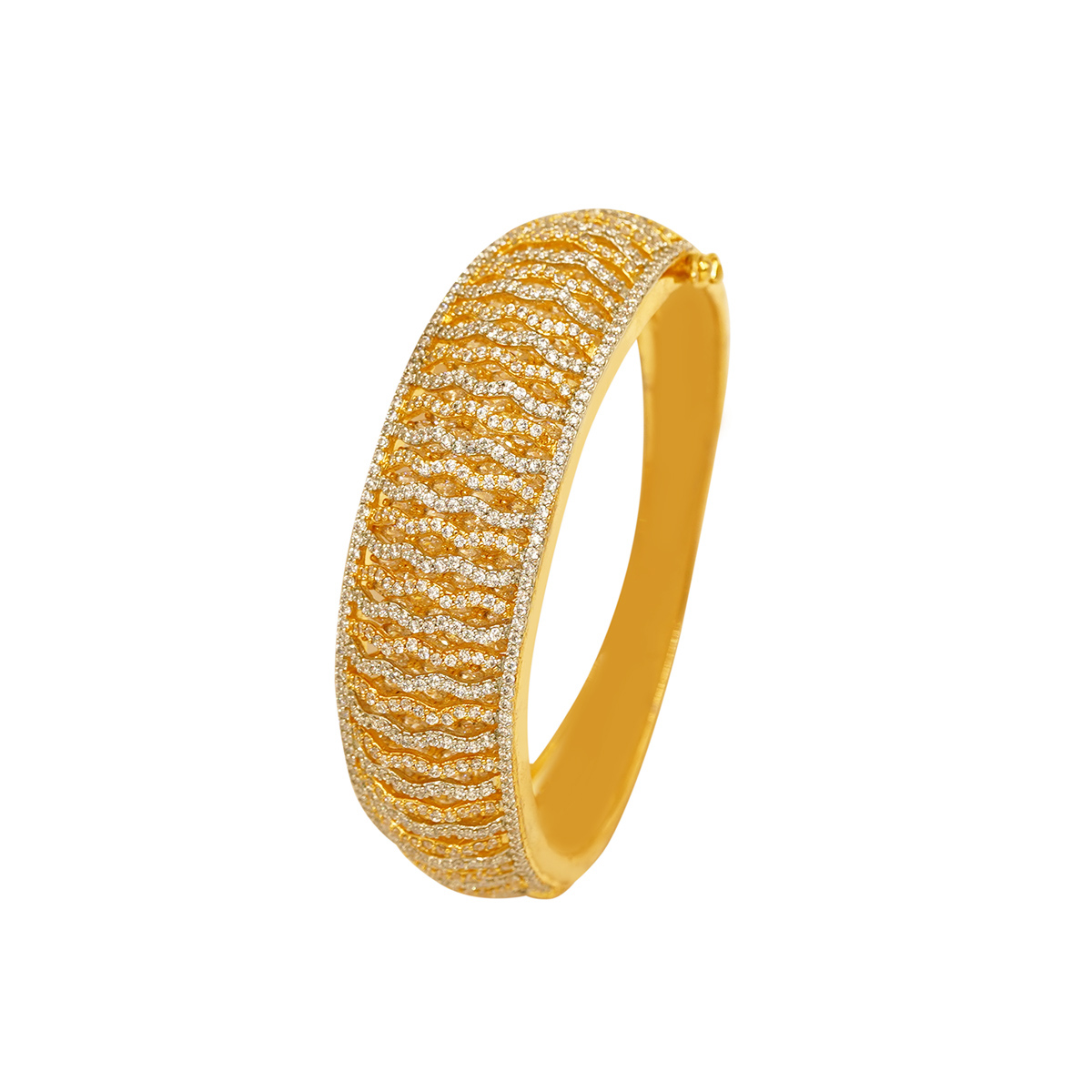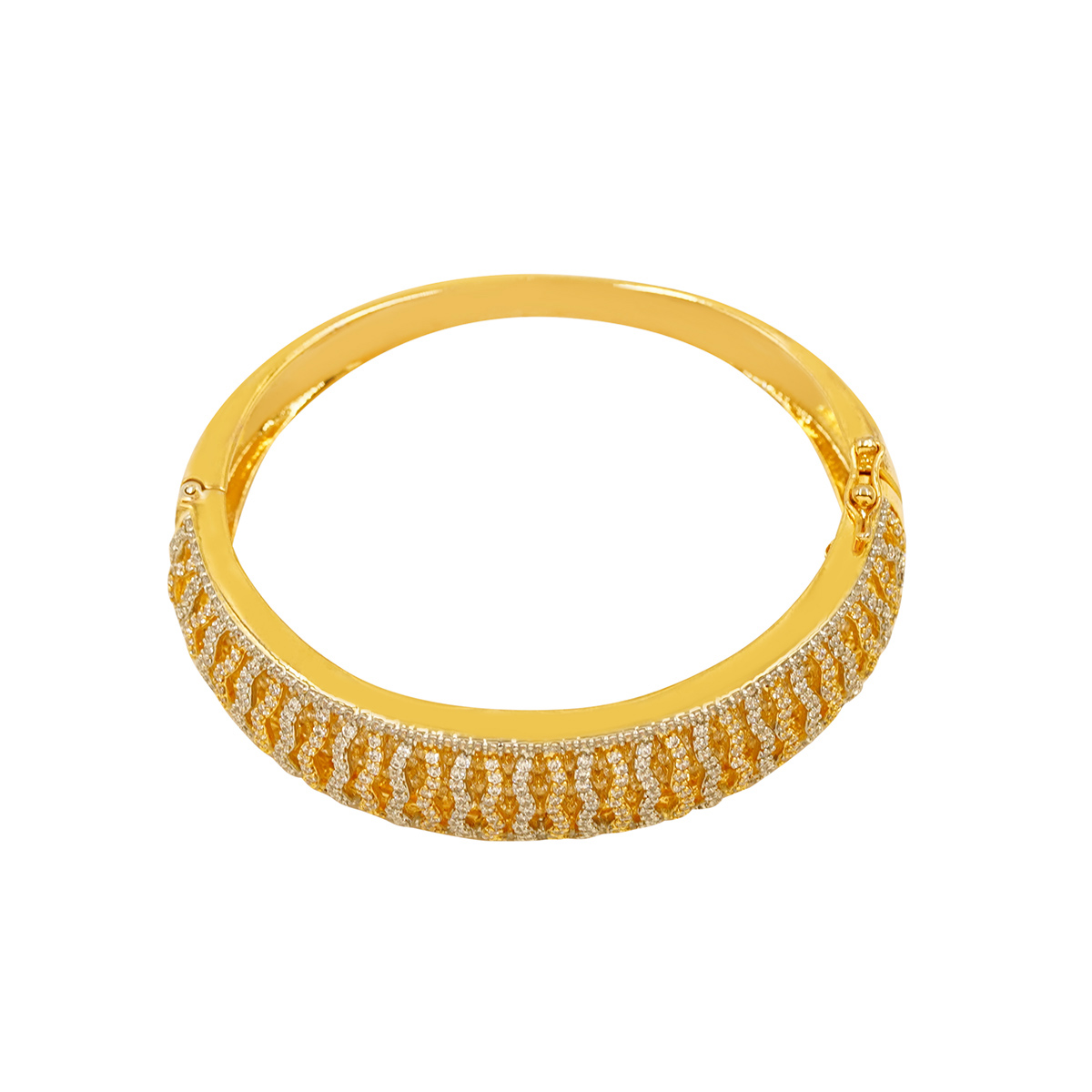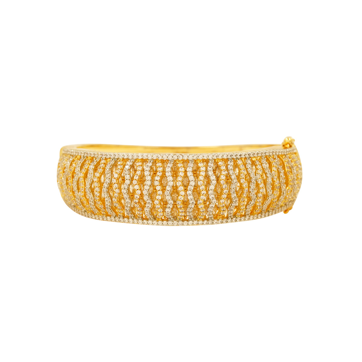 DESCRIPTION - THIS STUNNING BRACELET FEATURES A LUXURIOUS TWISTED WAVE PATTERN CRAFTED WITH SPARKLING DIAMOND-STYLE STONES. THE ALTERNATING GOLD AND SILVER-TONE DETAILING GIVES IT A RICH, DIMENSIONAL LOOK WHILE MAINTAINING A REFINED ELEGANCE. ITS SMOOTH CURVED STRUCTURE BEAUTIFULLY WRAPS AROUND THE WRIST, MAKING IT BOTH COMFORTABLE AND EYE-CATCHING. IDEAL FOR WEDDINGS, PARTIES, AND FESTIVE OCCASIONS, THIS BRACELET ADDS A SOPHISTICATED SHINE TO ANY OUTFIT.