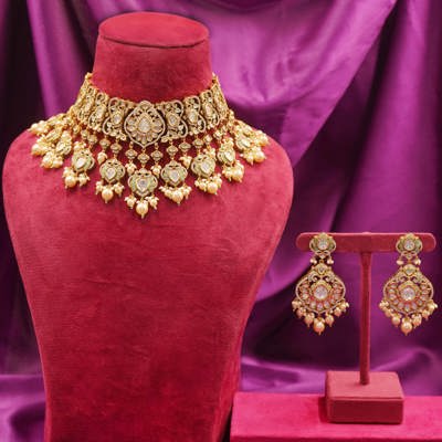 DESCRIPTION - Kundan Necklace Set / Choker Set / White Kundan Pearl Necklace Set Make a majestic statement with this White Kundan Necklace set, featuring an ornate gold-toned necklace, coordinating chandbali earrings, and a beautifully crafted maang tikka. The intricate design showcases heart-shaped Kundan stones, elegant pearl drops, and traditional Indian craftsmanship, creating a look of opulence and timeless grace.