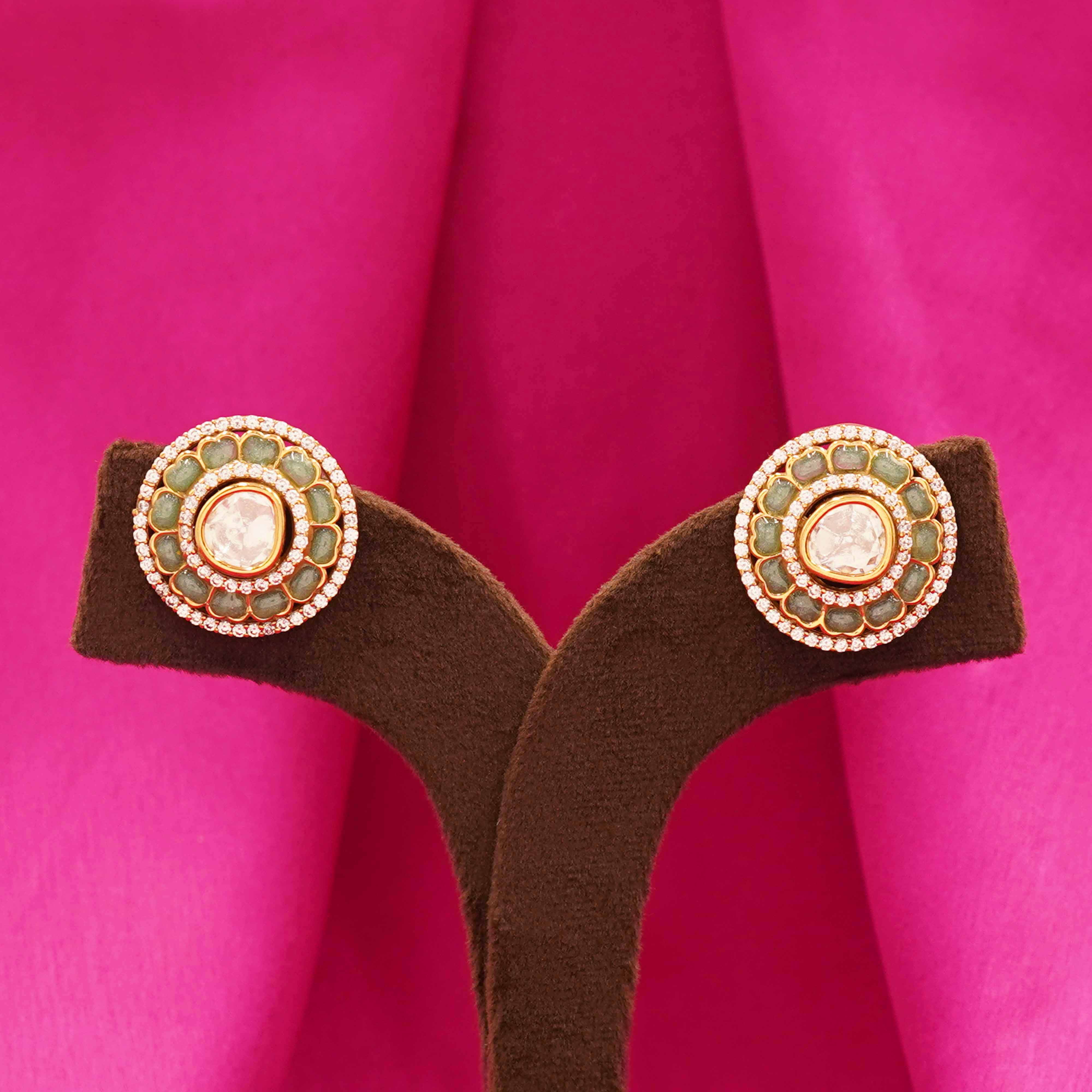 DESCRIPTION - Kundan Earring / Earring / Studs / Tops /Pastel Mint Kundan Earrings Elegant and understated, these pastel mint green stud earrings feature a beautifully crafted circular design that radiates sophistication. The soft green enamel petals encircle a luminous center stone, bordered by delicate shimmering accents, giving it a graceful floral appeal.