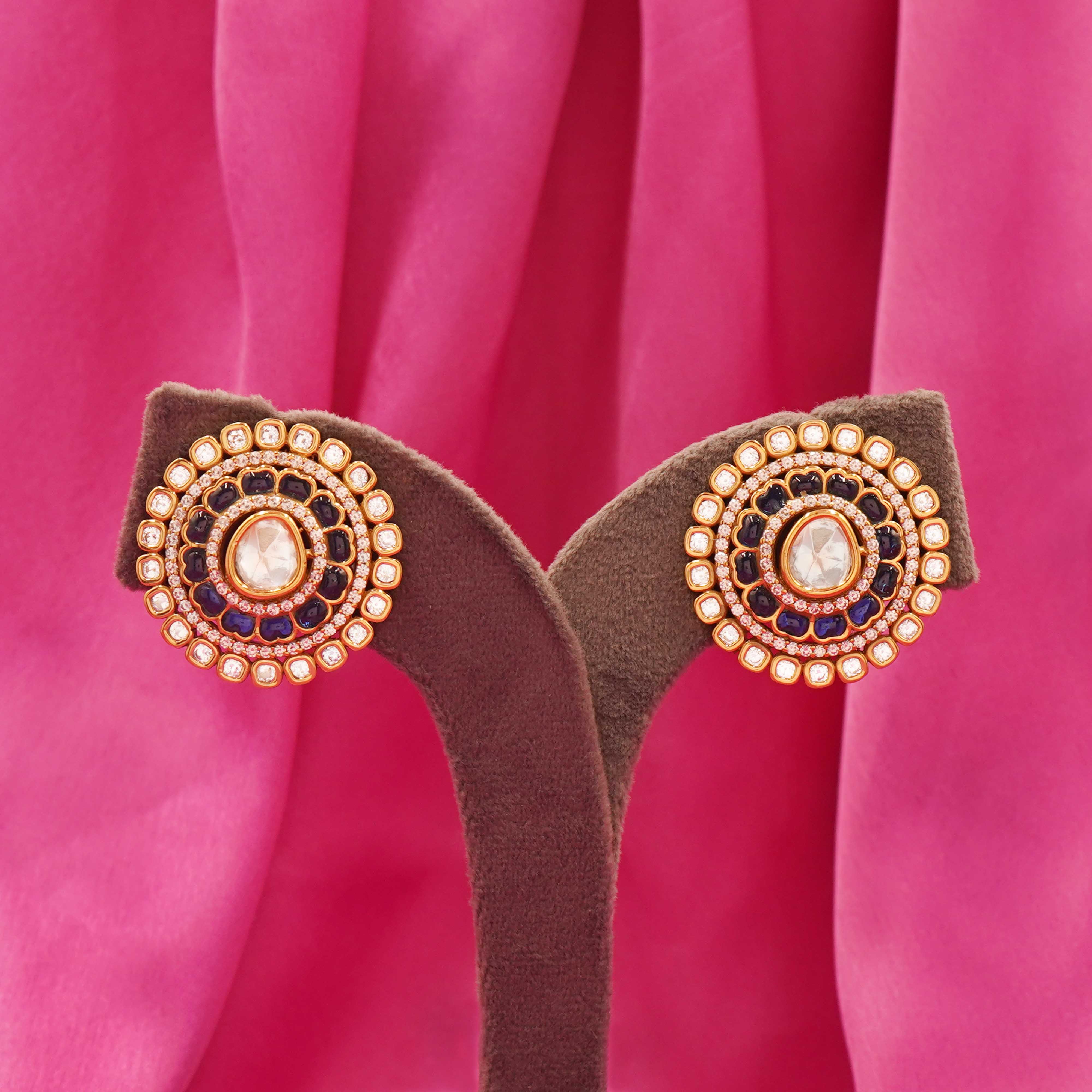 DESCRIPTION - Kundan Earring / Earring / Studs / Tops / Midnight Blue Radiance Stud Earrings Add a bold touch of elegance to your ensemble with these Midnight Blue Radiance Stud Earrings. Perfect for festive events, traditional celebrations, or evening wear, these statement earrings bring together classic charm with a rich, contemporary color palette — all in a premium artificial finish.