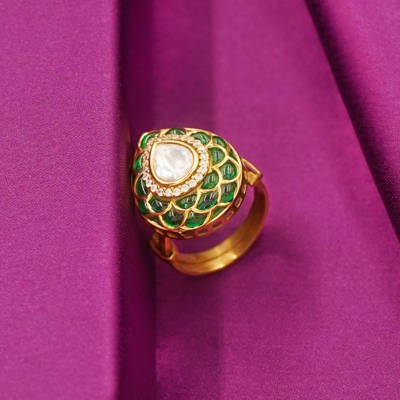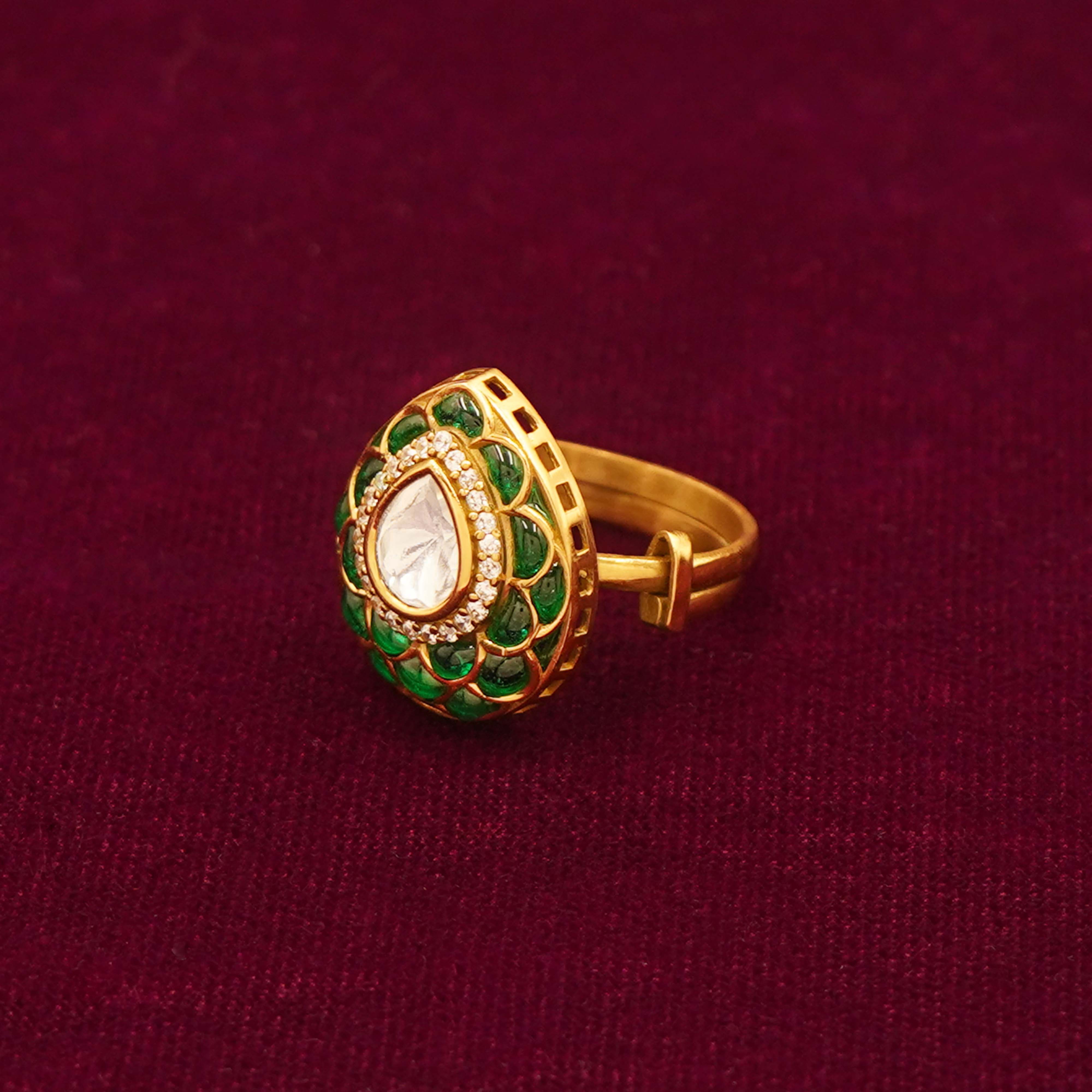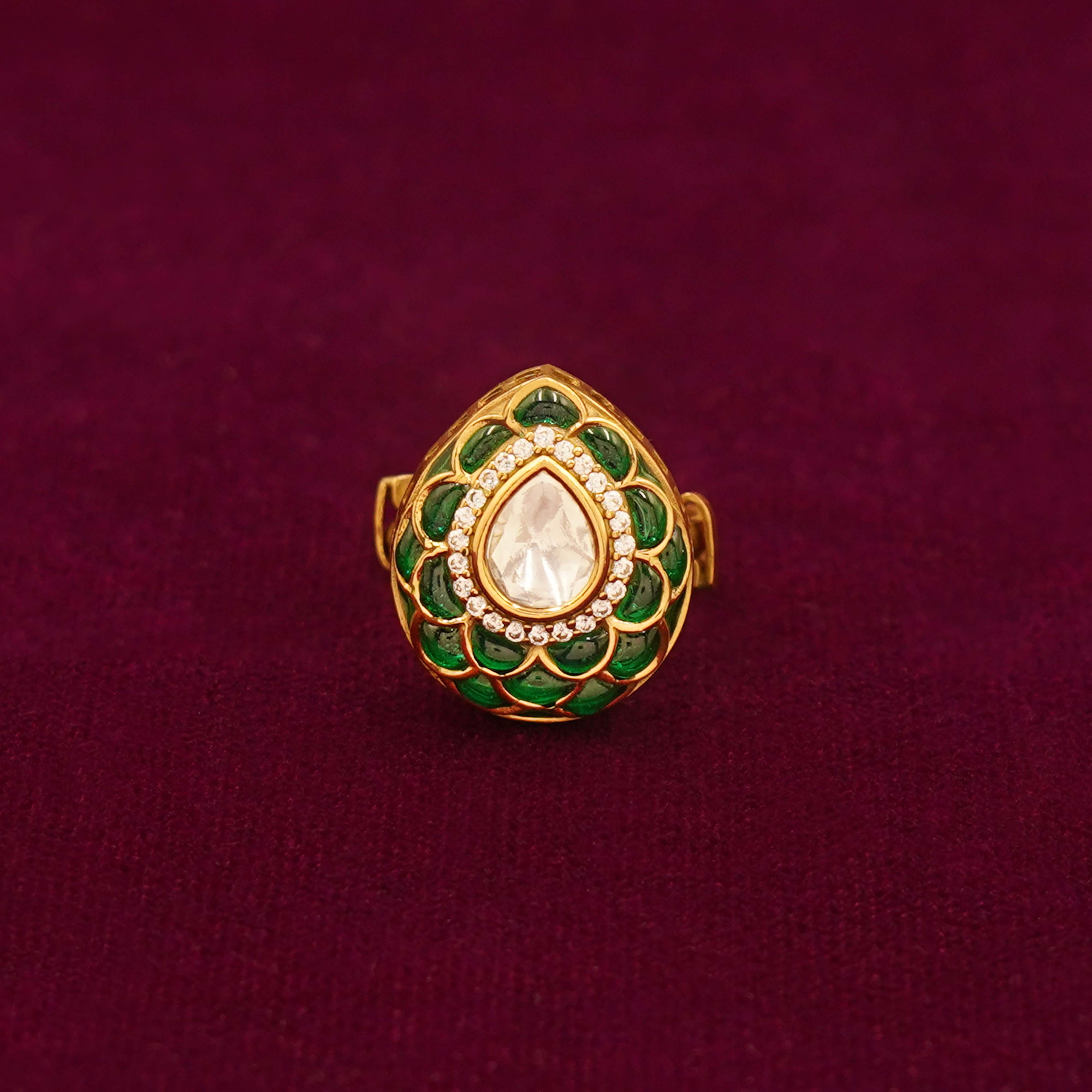 DESCRIPTION - A CAPTIVATING STATEMENT RING CRAFTED IN A RICH GOLD TONE FINISH, ADORNED WITH A LUMINOUS CENTRAL KUNDAN STONE AND SURROUNDED BY INTRICATE GREEN ENAMEL DETAILING. THE FLORAL-INSPIRED DESIGN REFLECTS TRADITIONAL INDIAN ARTISTRY, MAKING IT A PERFECT ACCENT FOR WEDDINGS, FESTIVE OCCASIONS, AND ROYAL-INSPIRED ENSEMBLES. ELEGANT, BOLD, AND TIMELESS — A TRUE CENTERPIECE FOR YOUR JEWELRY COLLECTION.