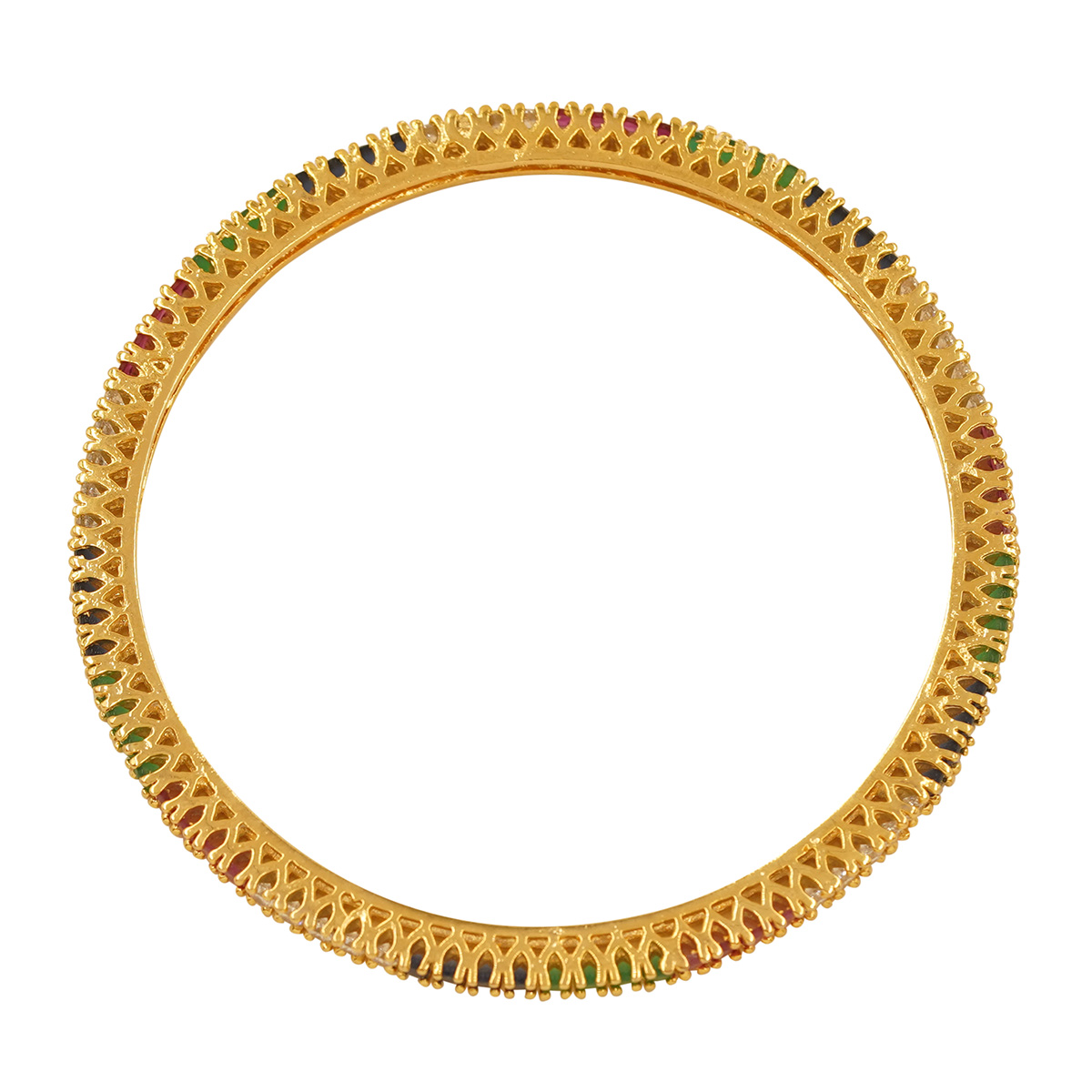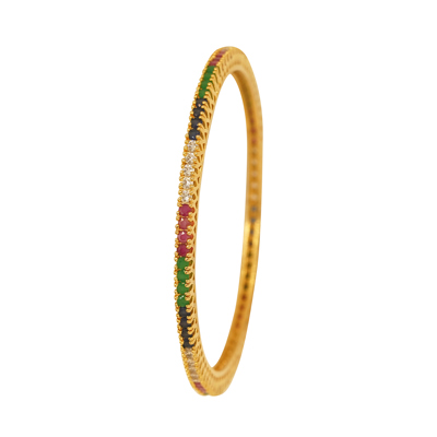 DESCRIPTION - THESE BEAUTIFULLY CRAFTED GOLD BANGLES FEATURE A REFINED COMBINATION OF MULTICOLORED STONES IN SHADES OF GREEN, RED, AND WHITE. THE TRIPLE-LINE STONE ARRANGEMENT GIVES THEM A VIBRANT YET SOPHISTICATED APPEAL, MAKING THEM PERFECT FOR FESTIVE WEAR, TRADITIONAL OUTFITS, AND SPECIAL OCCASIONS.