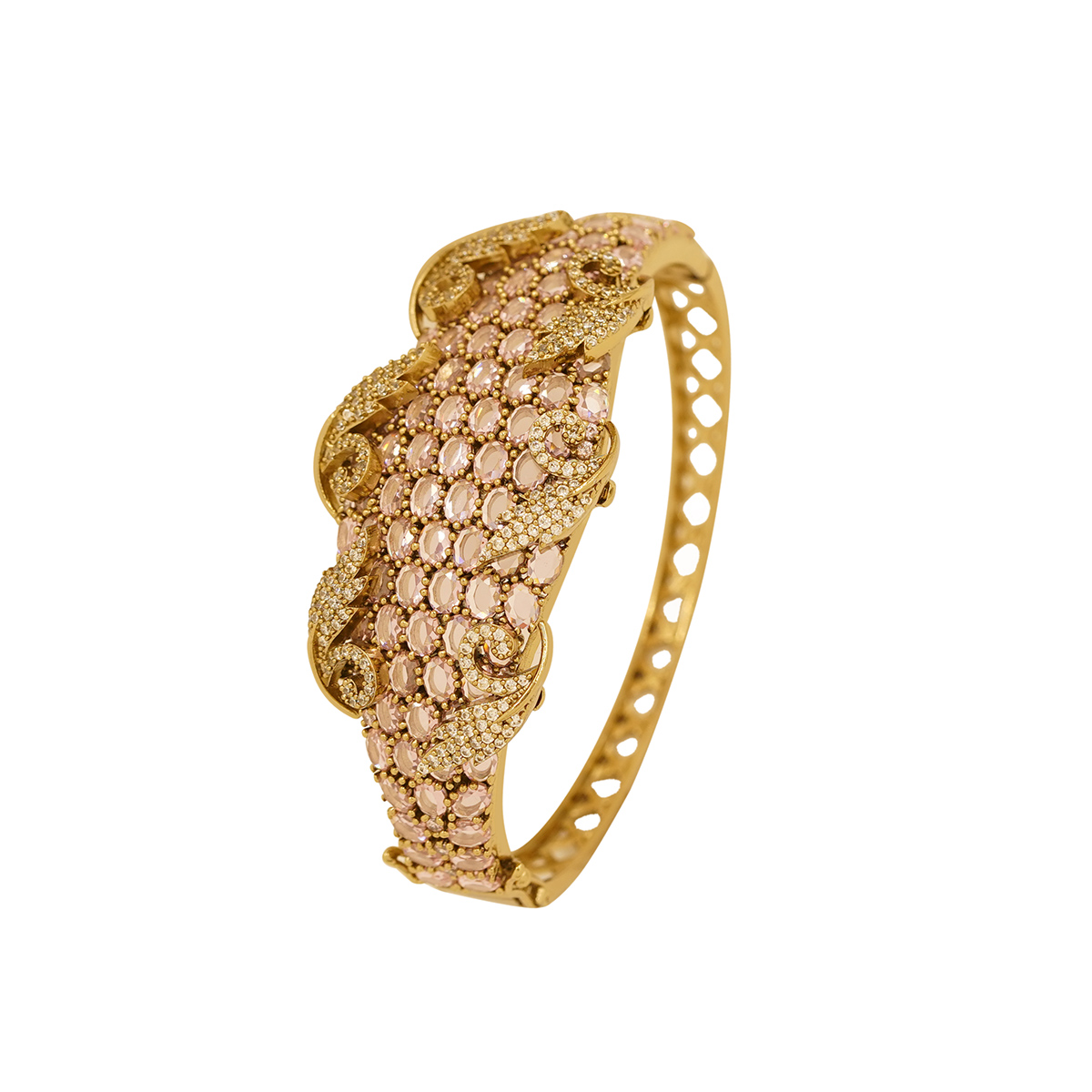 DESCRIPTION - THIS BRACELET FEATURES GOLD TONE-PLATED BANGLES WITH AN INTRICATE LATTICE CUTWORK DESIGN AND A TEXTURED SHIMMERING FINISH. THE ELEGANT DESIGN IS DESCRIBED AS A BLEND OF TRADITIONAL ARTISTRY AND CONTEMPORARY CHARM, SUITABLE FOR VARIOUS OCCASIONS FROM DAILY WEAR TO FESTIVE EVENTS.