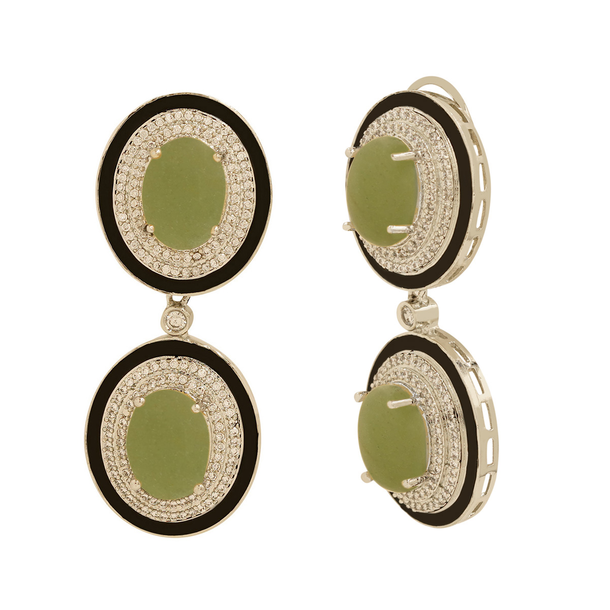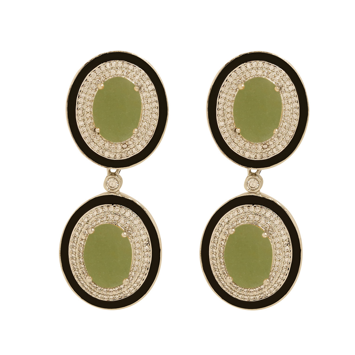 Elegant Green Dual-Oval Drop Earrings | Black Enamel & Crystal Detailing