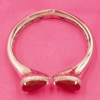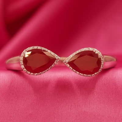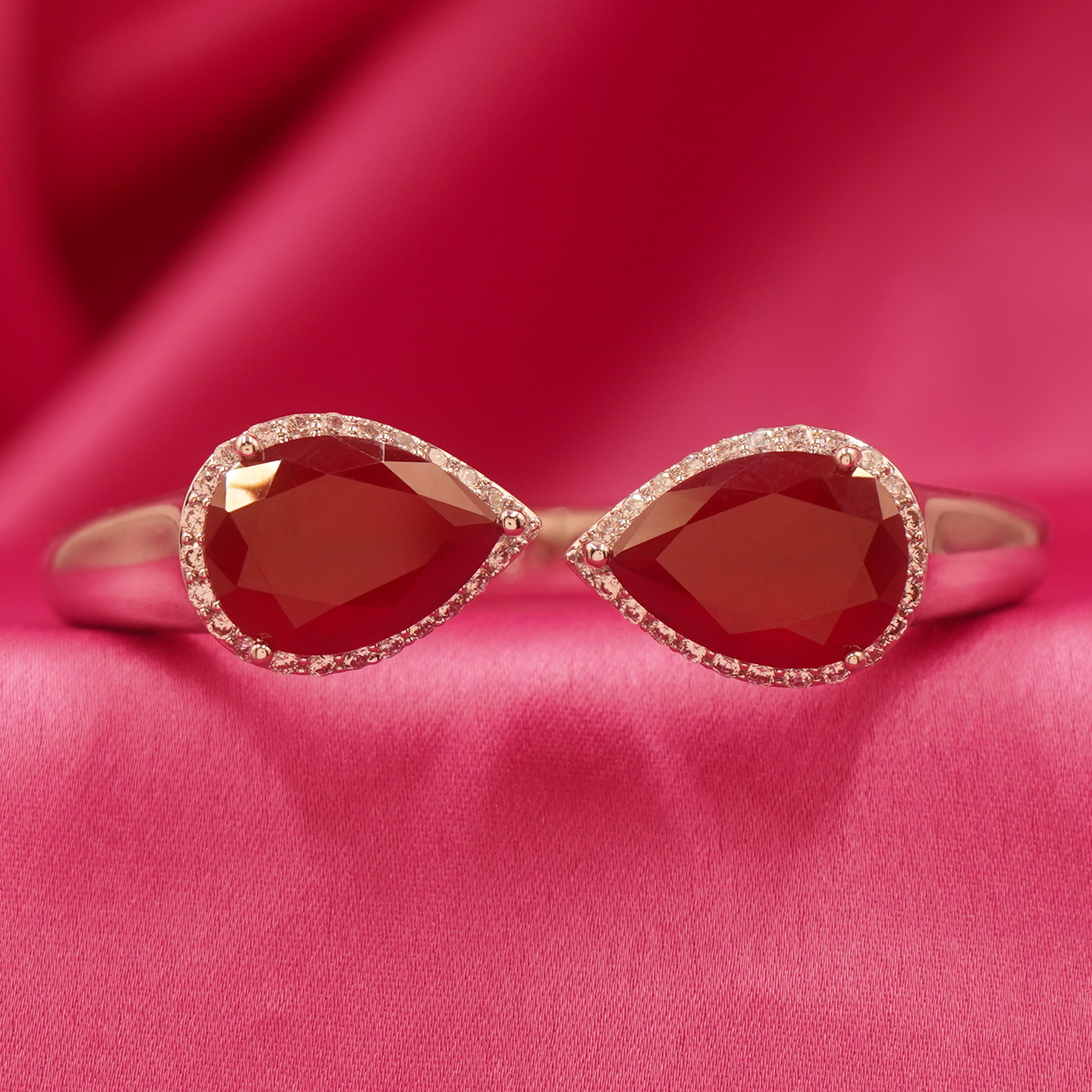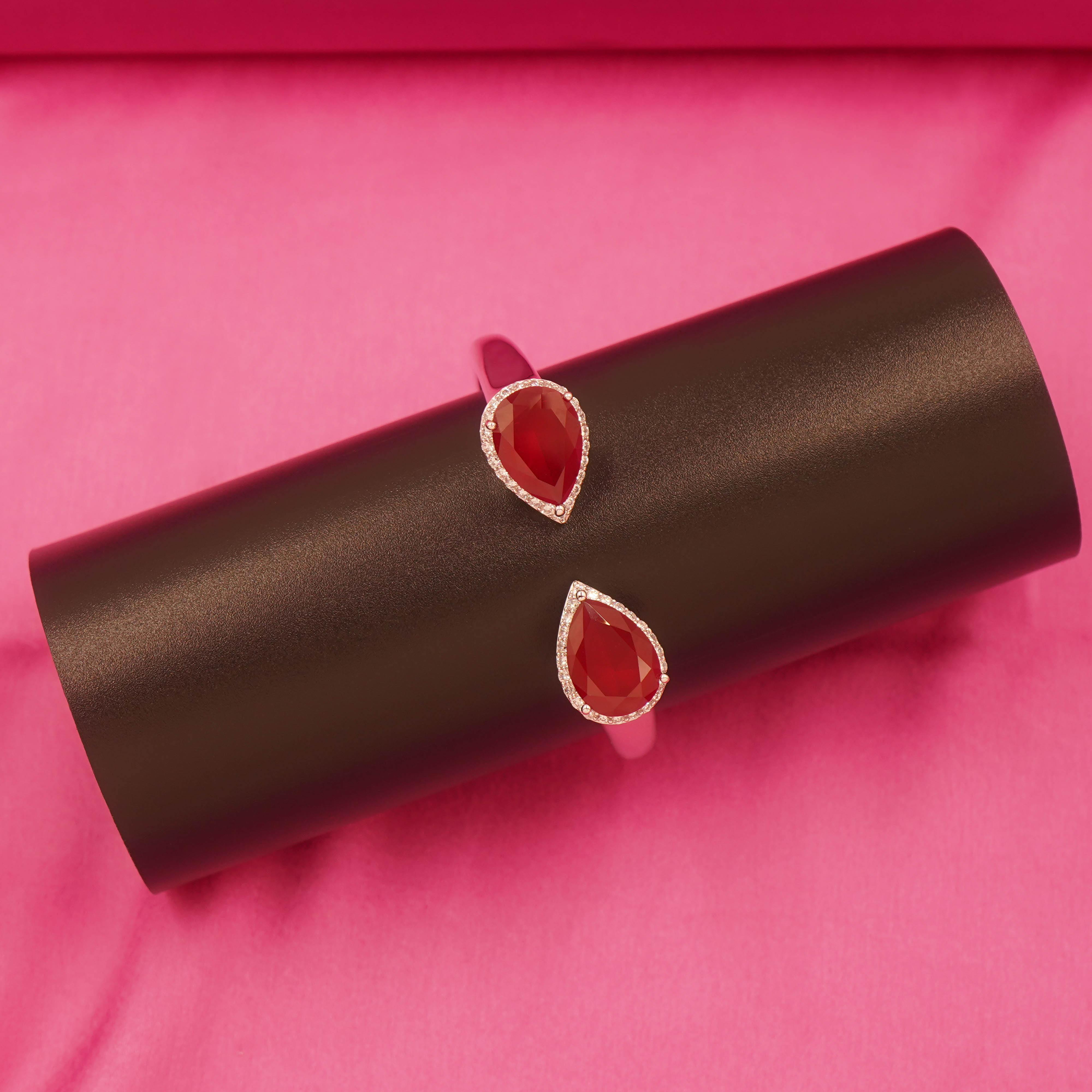 DESCRIPTION - This elegant open cuff bracelet features two striking red teardrop-shaped zircon stones, each surrounded by a delicate border of shimmering accents. A bold yet refined piece, perfect for adding a pop of color and sophistication to your look.