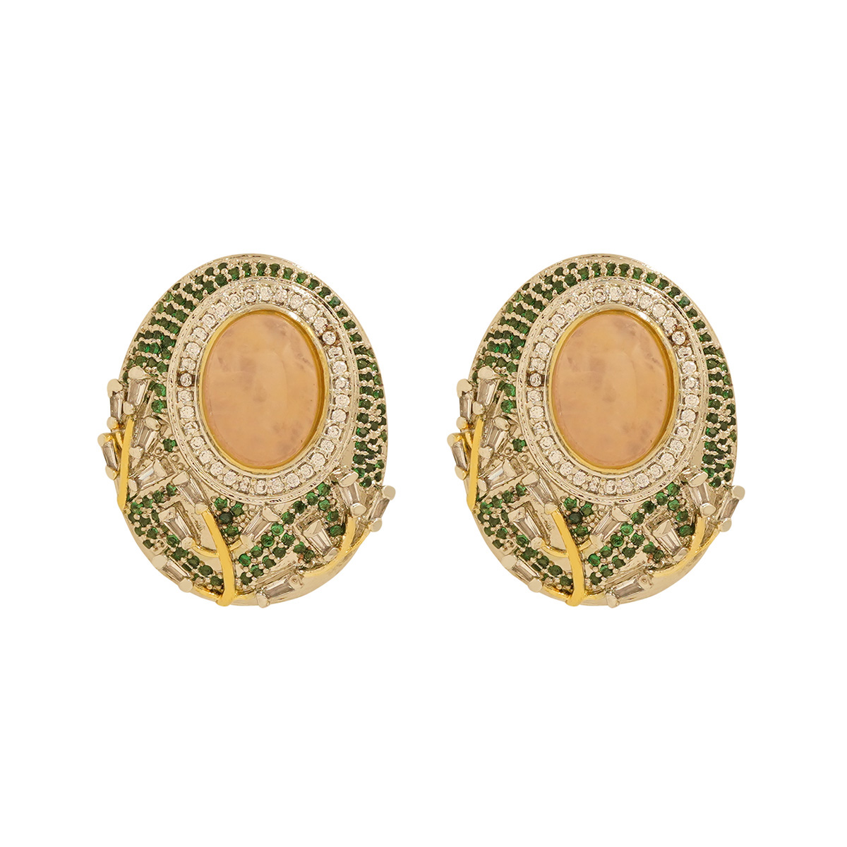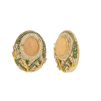 DESCRIPTION - Add a touch of classic charm to your look with these beautiful oval designer earrings, featuring a smooth beige centerpiece surrounded by sparkling crystals and intricate green bead detailing. These earrings are stylish, eye-catching, and crafted to enhance your elegance effortlessly.