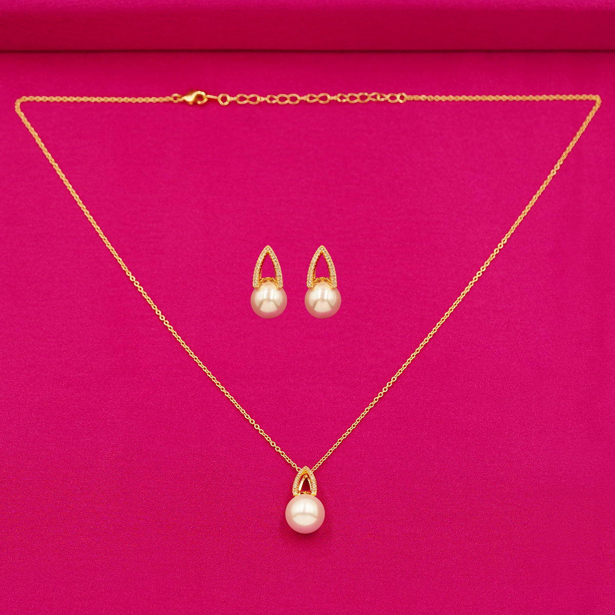 DESCRIPTION - This beautiful necklace and earring set showcases the timeless elegance of pearls. The necklace features a single, lustrous pearl pendant on a delicate chain, while the matching earrings mirror the design with a simple yet elegant pearl drop. Note that the materials used are not gold or silver, yet the design offers a luxurious and polished look, ideal for formal events or as a thoughtful gift.