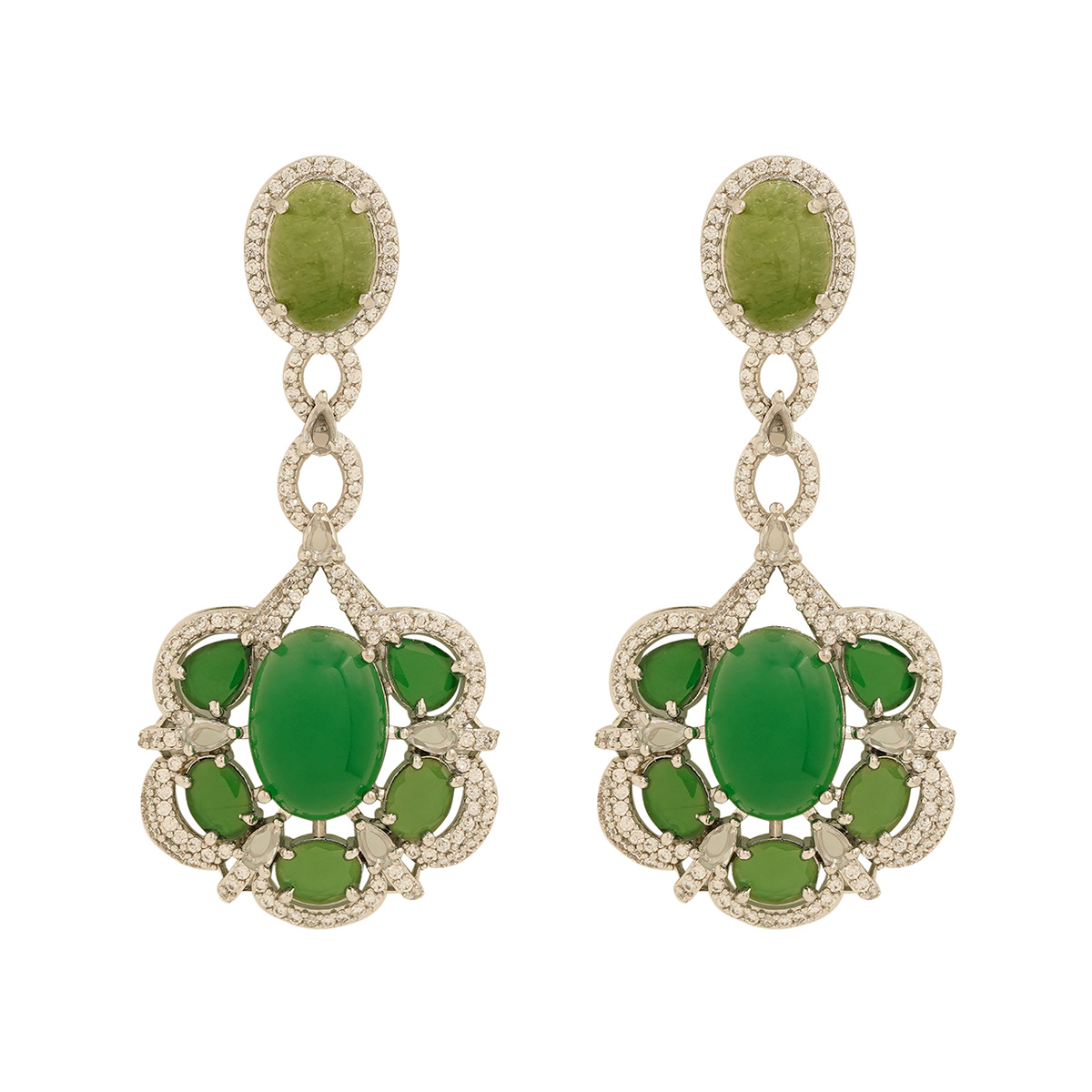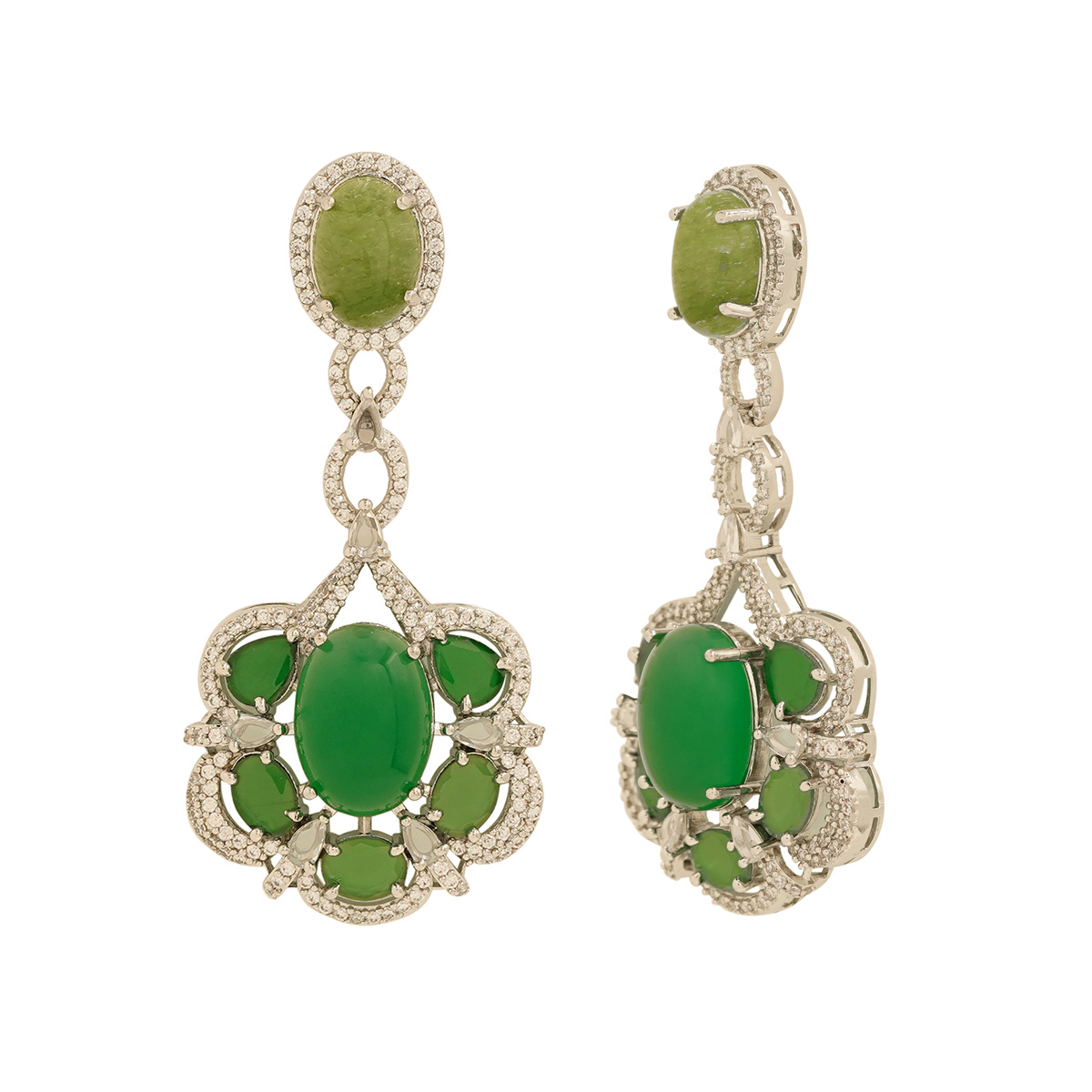 DESCRIPTION - These sophisticated drop earrings feature a silver-tone setting adorned with rich green gemstones in varying shades.The centerpiece is a smooth oval green stone, surrounded by smaller coordinating gems and bordered with shimmering crystal accents. Perfect for adding a refined pop of color, these earrings bring a blend of elegance, charm, and timeless beauty to any outfit.