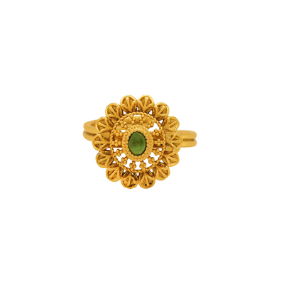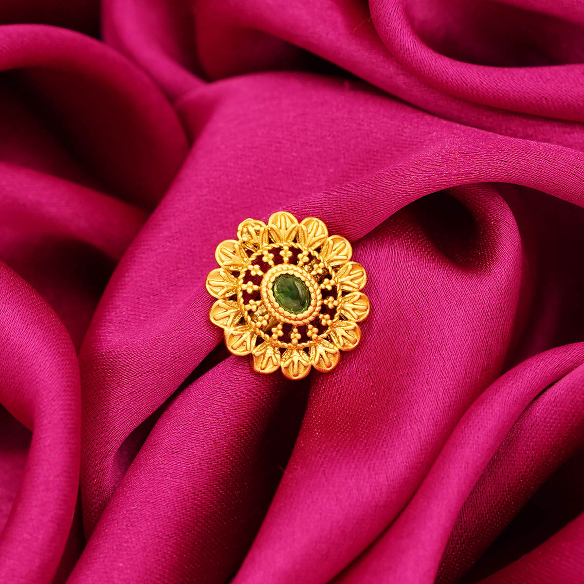 DESCRIPTION - THE RING IN THE IMAGE IS FORMALLY TITLED THE ESTELE GOLD TONE PLATED BLOSSOM MATTE FINISH ADJUSTABLE FINGER RING WITH GREEN CRYSTALS. IT FEATURES A LARGE, TRADITIONAL INDIAN DESIGN WITH INTRICATE, LACE-LIKE METALWORK (FILIGREE STYLE) AND A PROMINENT CENTRAL GREEN STONE. THIS TYPE OF ORNATE AND OVERSIZED JEWELRY IS COMMONLY REFERRED TO AS A COCKTAIL OR STATEMENT RING.