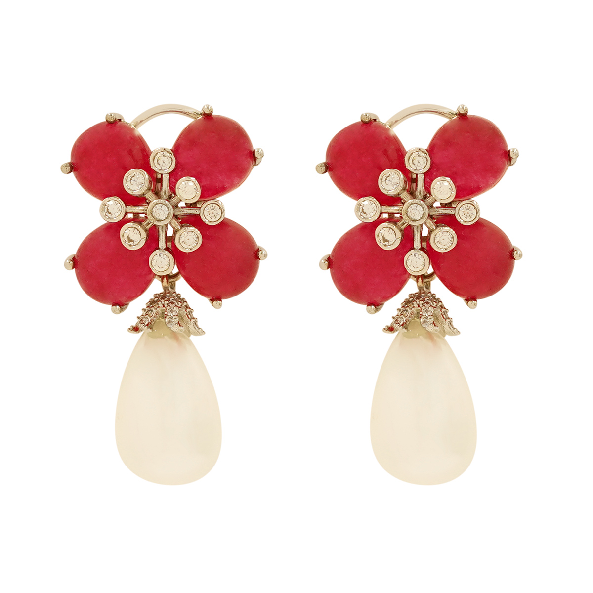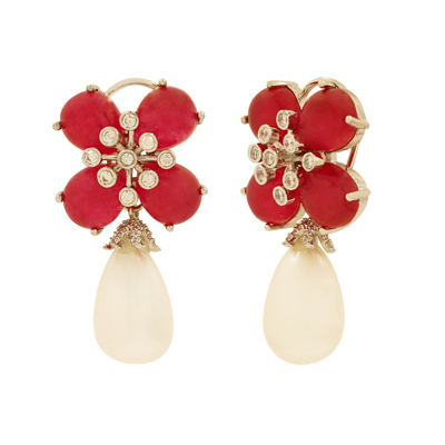 Floral Ruby-Pink Drop Earrings | Designer Pearl Drop