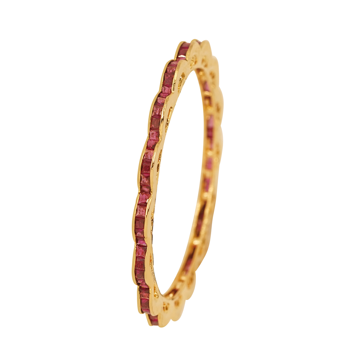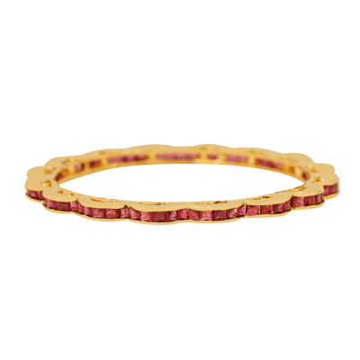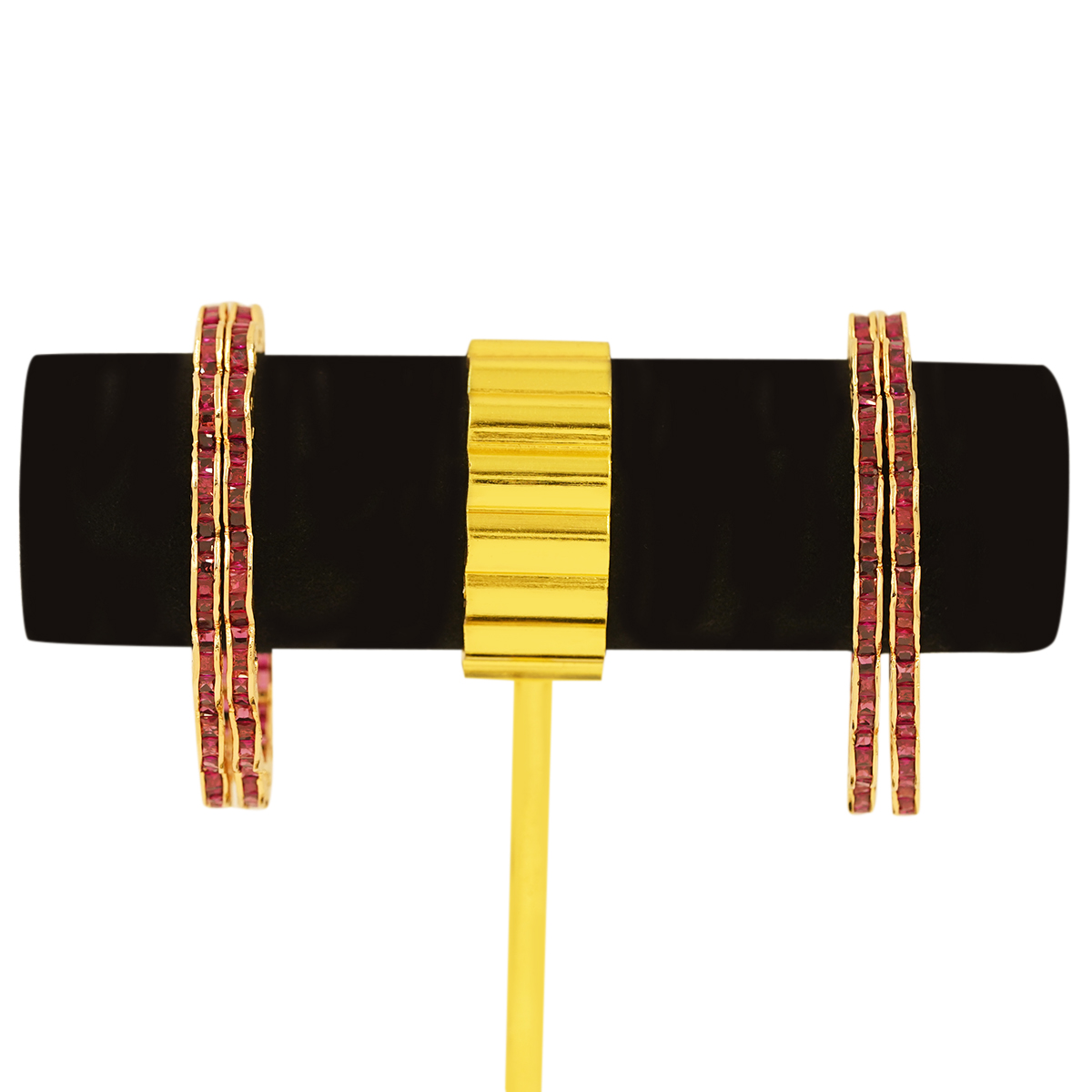 DESCRIPTION - THE IMAGE DISPLAYS TWO PAIRS OF NARROW BANGLES. THE PRIMARY COLOR IS A POLISHED GOLD TONE, LIKELY MADE FROM A BASE METAL WITH GOLD PLATING. THE DESIGN INCORPORATES SMALL, SQUARE-CUT STONES OR ENAMEL ACCENTS IN A DEEP RED OR MAROON COLOR SET ALONG THE SURFACE. THESE ARE A COMMON STYLE OF TRADITIONAL INDIAN JEWELRY (KANGAN OR CHURI), TYPICALLY WORN IN SETS FOR DAILY USE OR FESTIVE OCCASIONS.