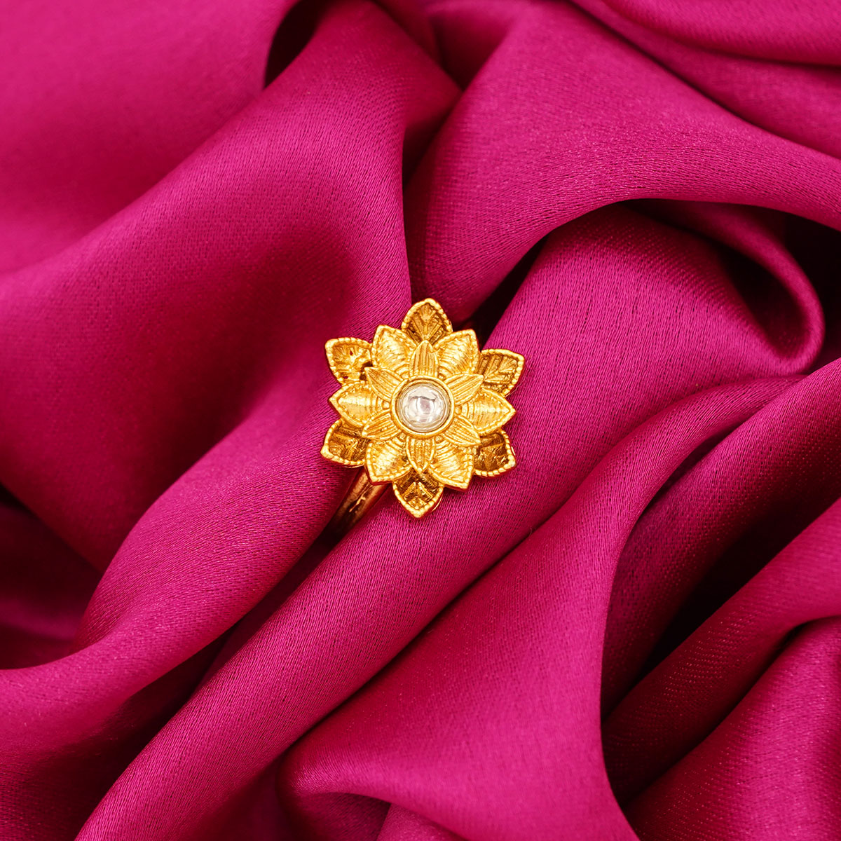 DESCRIPTION - INSPIRED BY THE TIMELESS BEAUTY OF BLOOMING PETALS, THE GOLDEN TONE FLORAL RADIANCE RING FEATURES AN INTRICATELY CARVED FLOWER DESIGN IN RICH GOLD TONES. EACH DELICATELY TEXTURED PETAL SURROUNDS A LUMINOUS CENTRAL STONE, CREATING A CAPTIVATING PLAY OF LIGHT AND DETAIL. ELEGANT YET STRIKING, THIS RING BLENDS TRADITIONAL ARTISTRY WITH A CONTEMPORARY FINISH—PERFECT FOR FESTIVE OCCASIONS, WEDDINGS, OR ADDING A TOUCH OF REGAL CHARM TO EVERYDAY STYLE.