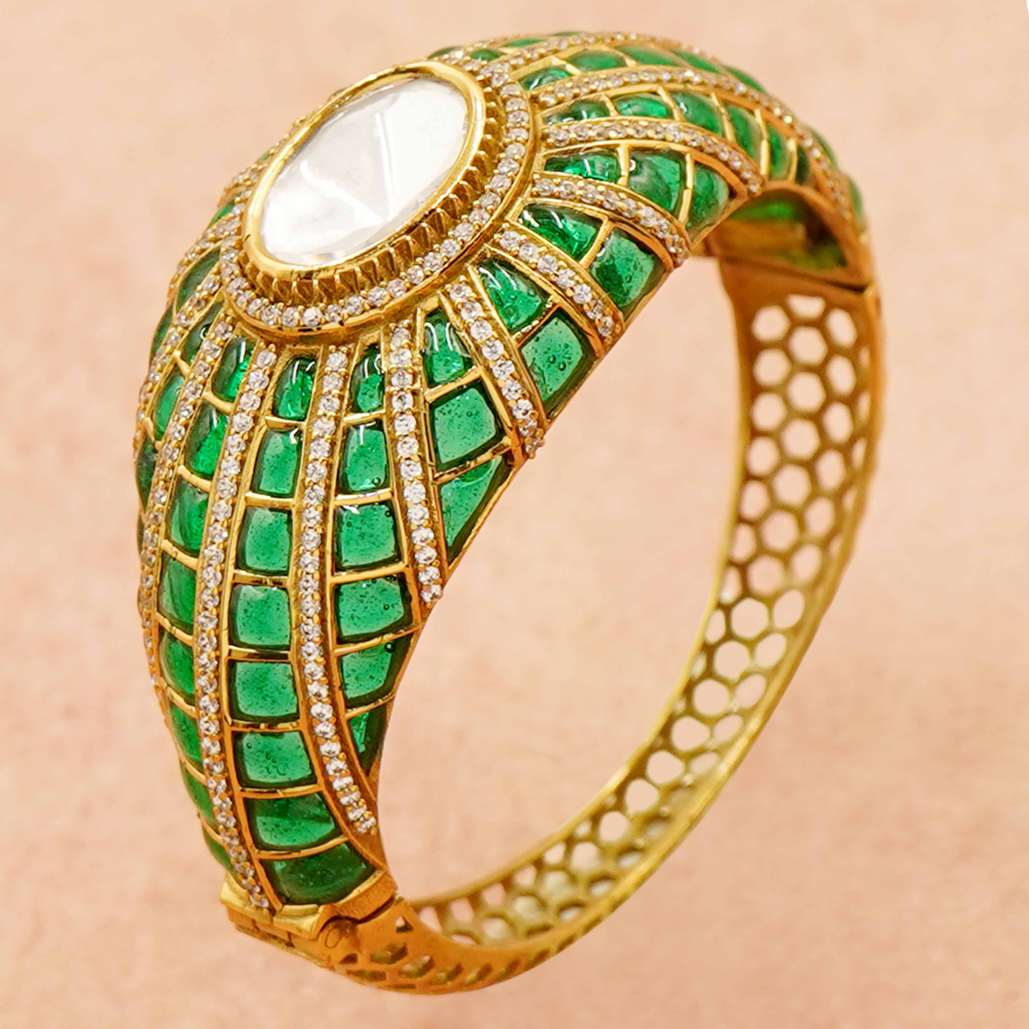 DESCRIPTION - MAKE A STRIKING STYLE STATEMENT WITH THIS EXQUISITE GREEN ENAMEL KUNDAN BRACELET. DESIGNED WITH A RADIANT CENTRAL STONE AND FRAMED BY SHIMMERING CUBIC ZIRCONIA ACCENTS, THIS PIECE SHOWCASES FINE CRAFTSMANSHIP AND ELEGANT DETAILING. THE RICH GREEN ENAMEL WORK ADDS A REGAL CHARM, MAKING IT PERFECT FOR WEDDINGS, FESTIVE OCCASIONS, AND TRADITIONAL CELEBRATIONS. LIGHTWEIGHT YET LUXURIOUS, THIS BANGLE PAIRS BEAUTIFULLY WITH ETHNIC OUTFITS SUCH AS SAREES, LEHENGAS, AND ANARKALIS, ADDING TIMELESS SOPHISTICATION TO YOUR JEWELRY COLLECTION.