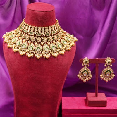 DESCRIPTION - Kundan Necklace Set / Choker Set / Majestic Kundan Bridal Necklace Set Elevate your bridal elegance with this opulent Kundan Necklace set featuring a grand choker necklace, matching earrings, and a delicate maang tikka. Designed with tear-drop shaped green meenakari accents, shimmering white stones, and lustrous pearl drops.