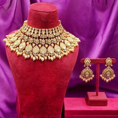 DESCRIPTION - Kundan Necklace Set / Choker Set / Majestic White Kundan Bridal Necklace Set Make a statement with this breathtaking Kundan choker necklace featuring exquisite Mint meenakari detailing and elegant tear-drop motifs. Intricately studded with shimmering stones and finished with delicate pearl drops, this layered necklace brings a perfect blend of tradition and luxury.