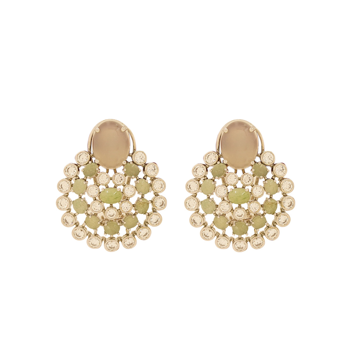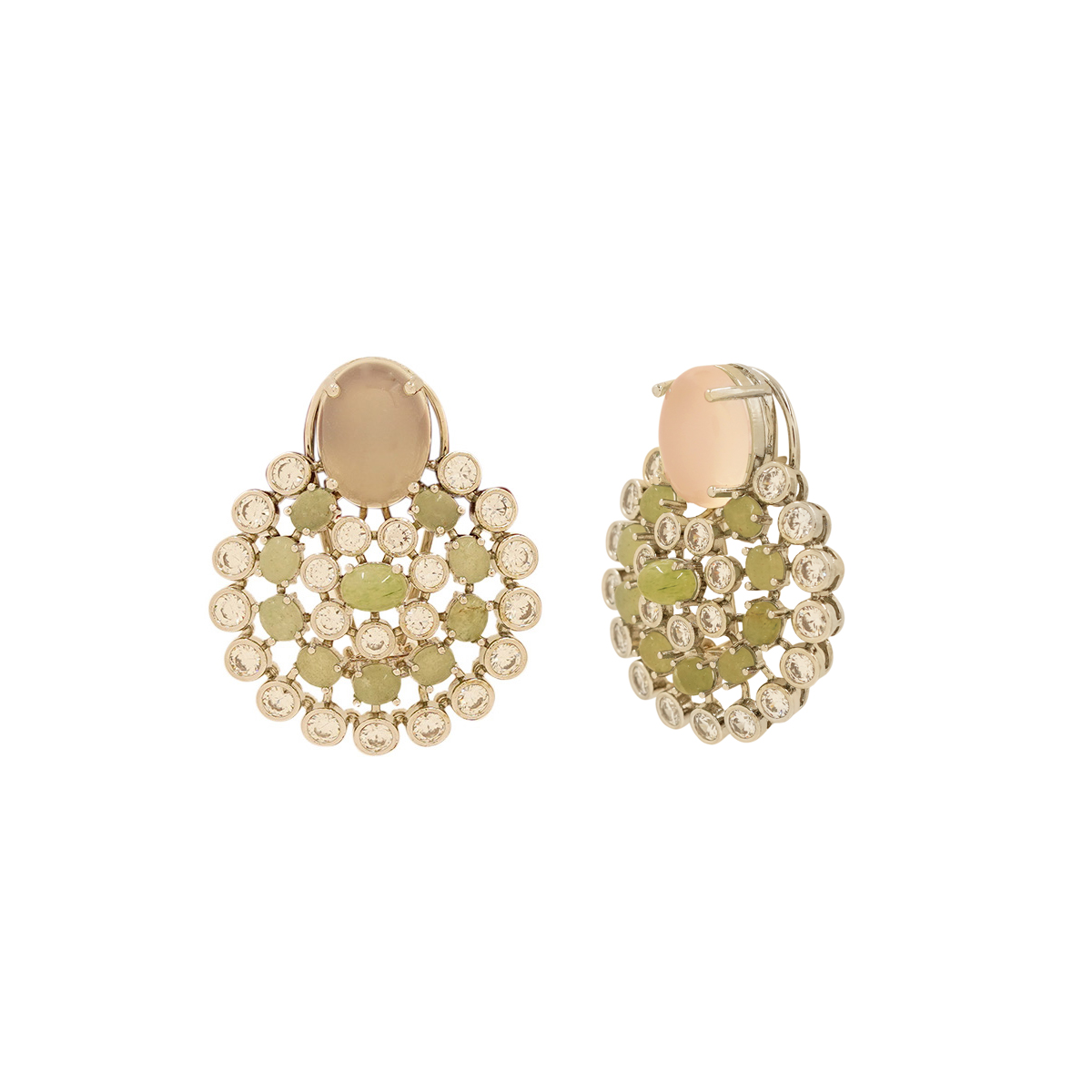 DESCRIPTION - These elegant earrings feature a beautiful mosaic-style circular design, crafted with soft pastel green stones arranged in a delicate cluster pattern. Perfect for festive outfits, wedding functions, parties, or everyday elegance—these lightweight statement earrings beautifully blend modern charm with traditional artistry.