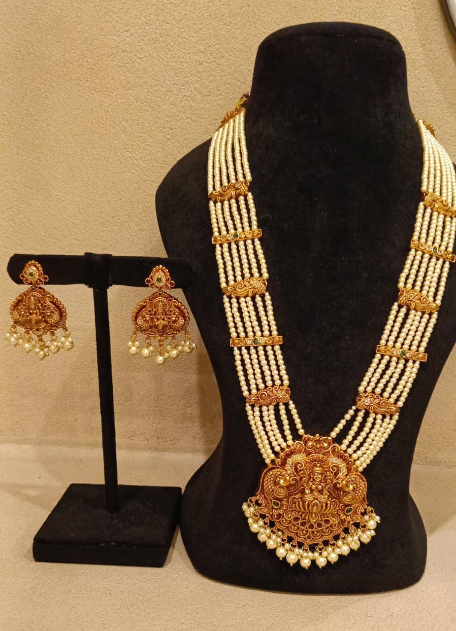 DESCRIPTION - An exquisite temple-style necklace set featuring rows of lustrous pearls adorned with traditional gold-toned spacers and a grand Lakshmi motif pendant. The intricately carved pendant, finished with delicate pearl drops, reflects timeless South Indian artistry and divine elegance. Paired with matching temple earrings, this set is perfect for weddings, festive occasions, and bridal wear, adding a rich, royal charm to any traditional ensemble.
