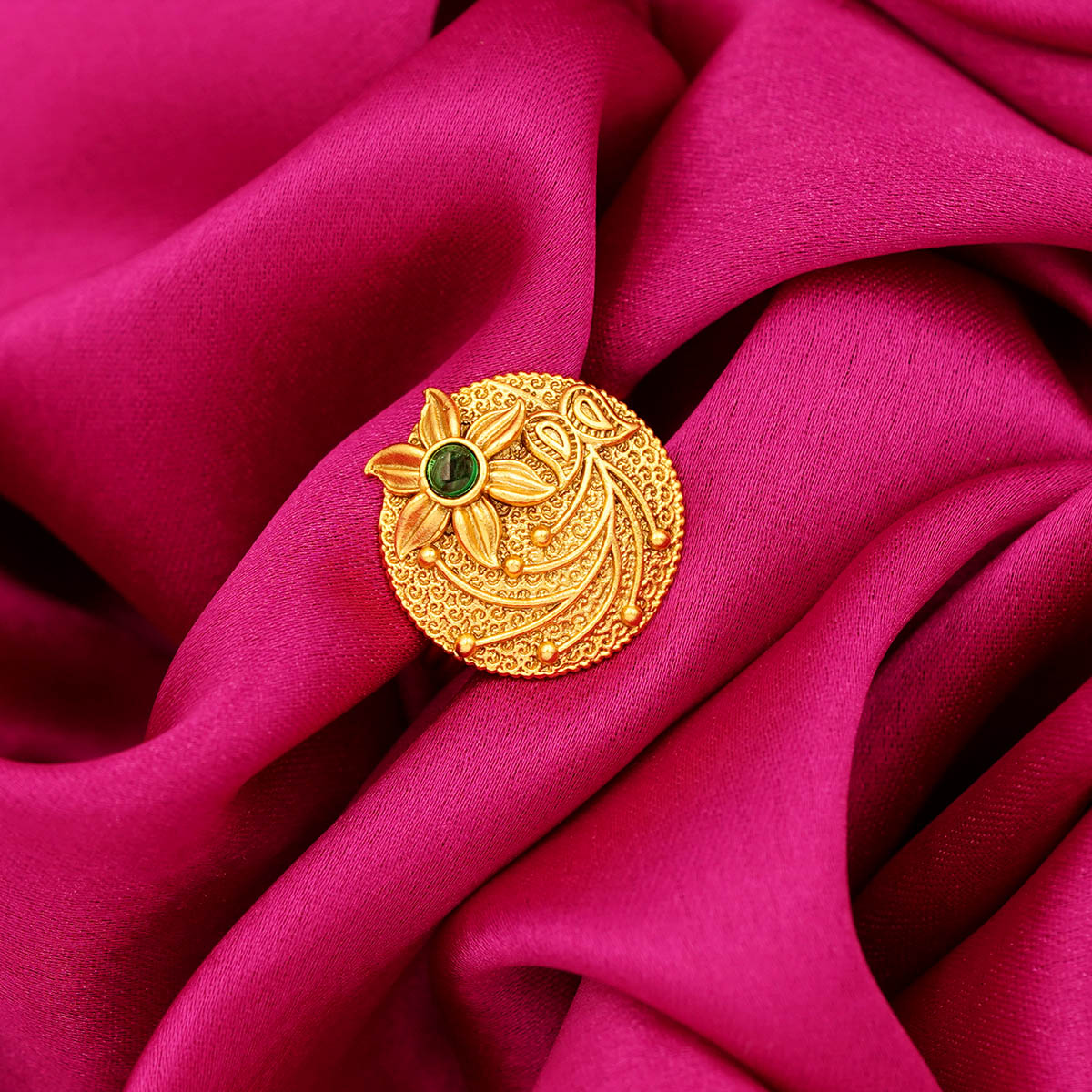 DESCRIPTION - THIS REGAL PEACOCK GOLD TONE RING IS A STRIKING STATEMENT OF ARTISTRY AND TRADITION. CRAFTED IN A RICH GOLD TONE FINISH, THE RING FEATURES INTRICATE FEATHER DETAILING THAT RADIATES GRACE AND GRANDEUR. AT ITS HEART LIES A DEEP GREEN STONE, ADDING A TOUCH OF ROYAL CHARM AND VIBRANT CONTRAST. PERFECT FOR FESTIVE OCCASIONS, WEDDINGS, OR ELEVATING YOUR EVERYDAY ETHNIC LOOK, THIS RING EMBODIES HERITAGE DESIGN WITH A BOLD, CONTEMPORARY APPEAL.