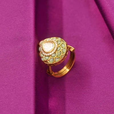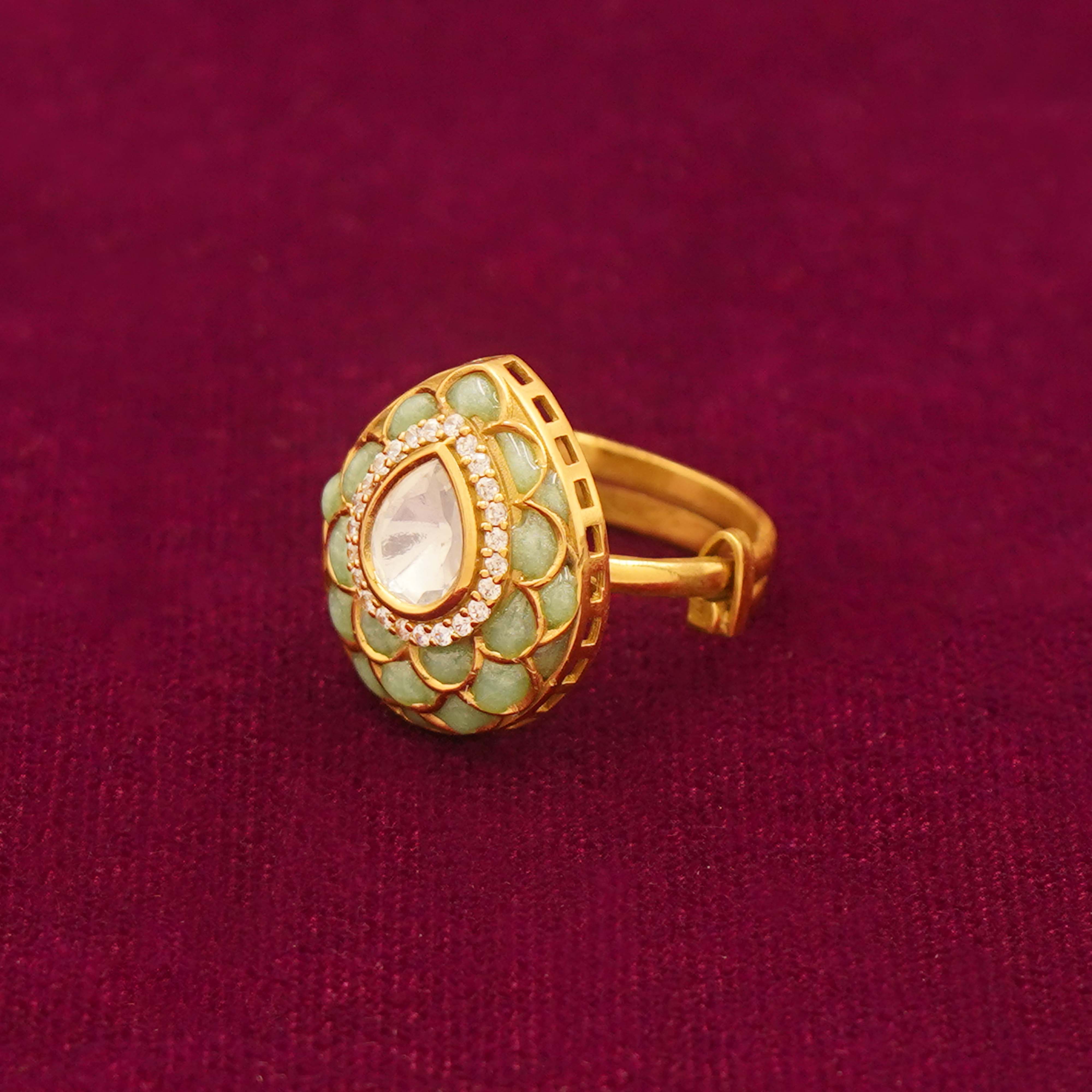 DESCRIPTION - A STRIKING STATEMENT RING CRAFTED IN A RICH GOLD-TONE FINISH, FEATURING A TEARDROP-SHAPED CENTERPIECE FRAMED BY INTRICATE POLKI-STYLE DETAILING. THE LUMINOUS CENTRAL STONE IS ENCIRCLED WITH DELICATE CRYSTAL ACCENTS, CREATING A ROYAL AND ELEGANT APPEAL. PERFECT FOR FESTIVE OCCASIONS, WEDDINGS, AND TRADITIONAL ENSEMBLES, THIS RING ADDS TIMELESS CHARM AND GRACEFUL SOPHISTICATION TO YOUR JEWELRY COLLECTION.
