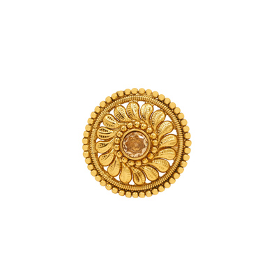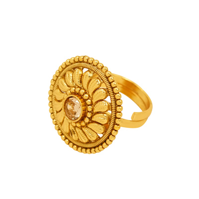 DESCRIPTION - A striking statement ring crafted in radiant gold tone, featuring a bold circular sunburst motif with intricate textured detailing. The layered concentric design reflects timeless regal artistry, making it a perfect choice for festive occasions, weddings, or as a standout accessory to elevate traditional attire. Elegant, powerful, and unmistakably royal in presence.