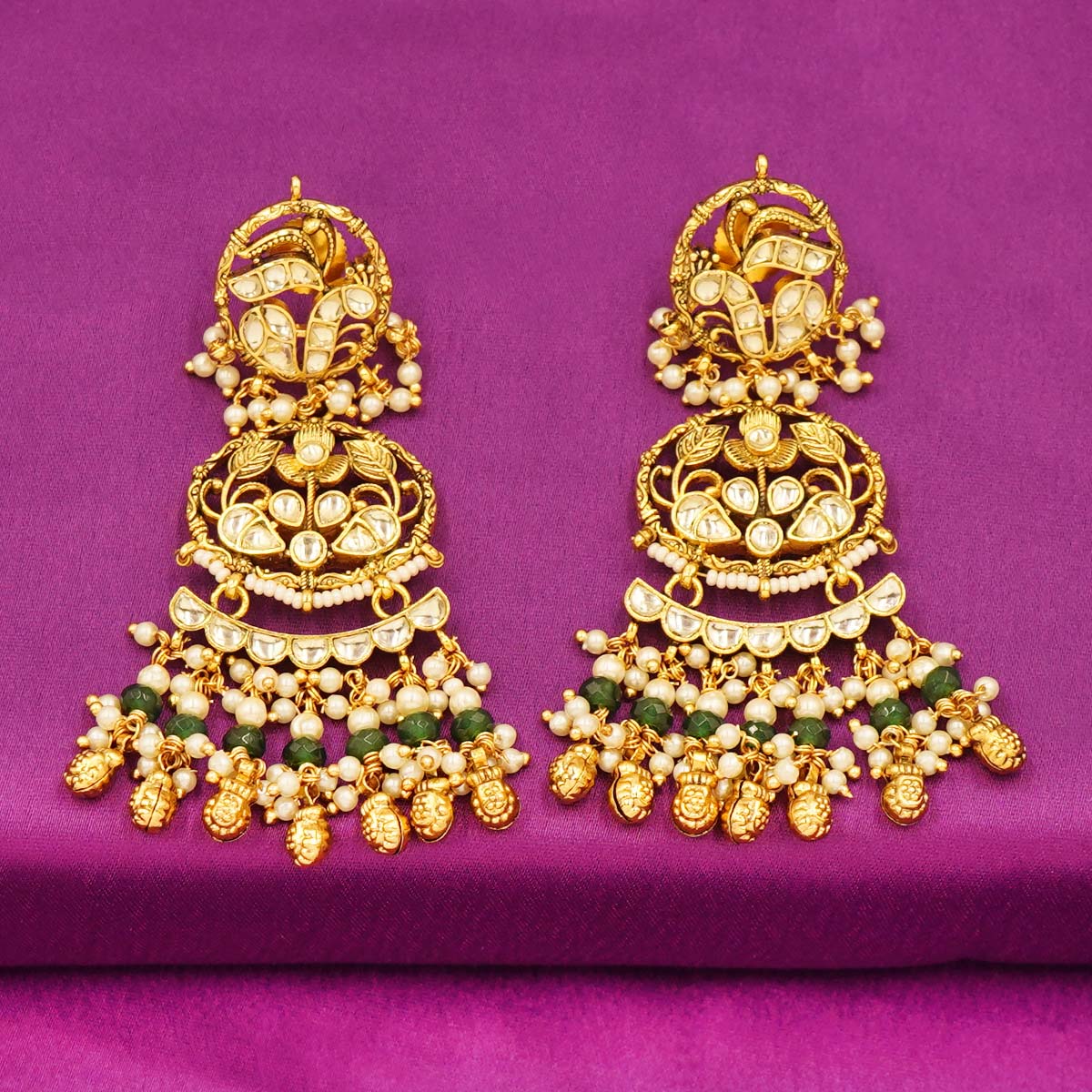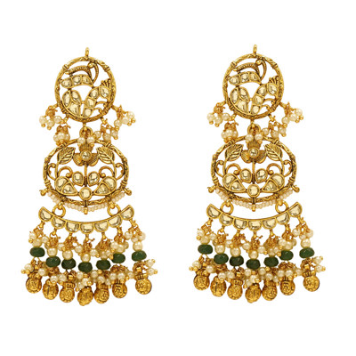 DESCRIPTION - Elevate your ethnic charm with these Royal Kundan & Pearl Layered Chandbali Earrings, a perfect combination of traditional craftsmanship and royal elegance. These long, multi-tiered earrings feature delicate Kundan work, pearl embellishments, and green bead accents, beautifully arranged in a classic floral and crescent motif.