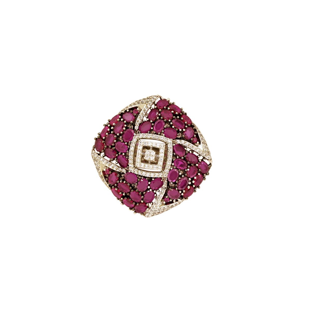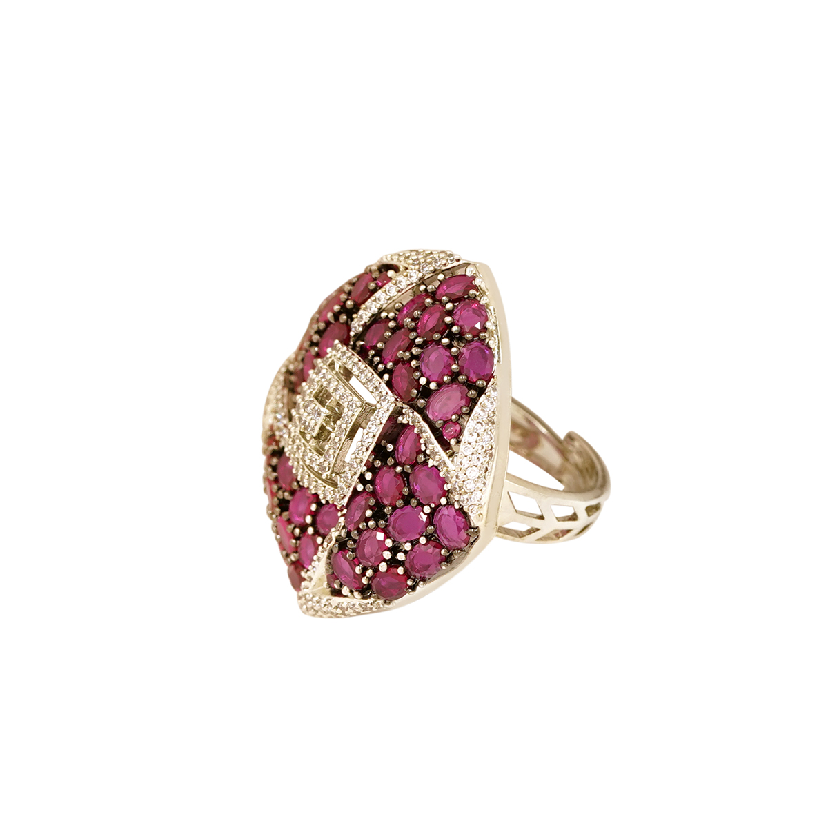 DESCRIPTION - The item in the image is a striking cocktail or statement ring featuring multiple red gemstones, which appear to be rubies or pink sapphires, and accenting white stones, likely diamonds or cubic zirconia. The overall design is large, ornate, and typically worn for formal events or special occasions.