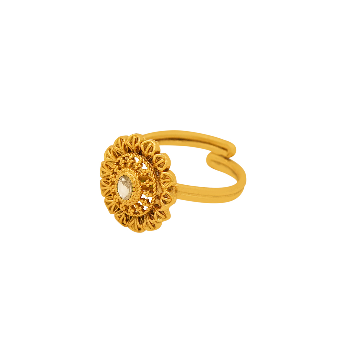 DESCRIPTION - TRADITIONAL INDIAN-STYLE COCKTAIL RING THAT IS TYPICALLY DESCRIBED AS A GOLD TONE-PLATED, ADJUSTABLE FINGER RING FEATURING INTRICATE FILIGREE WORK AND A CENTRAL WHITE STONE. DUE TO ITS ELABORATE AND OVERSIZED DESIGN, IT IS KNOWN AS A STATEMENT OR COCKTAIL RING, OFTEN WORN FOR FESTIVE OCCASIONS OR WEDDINGS.