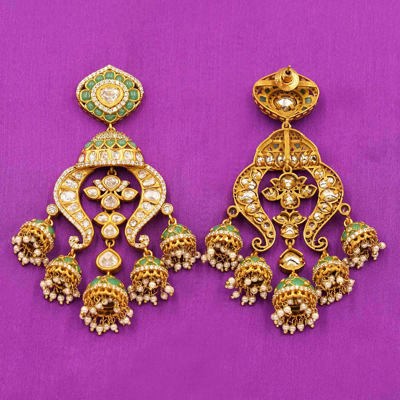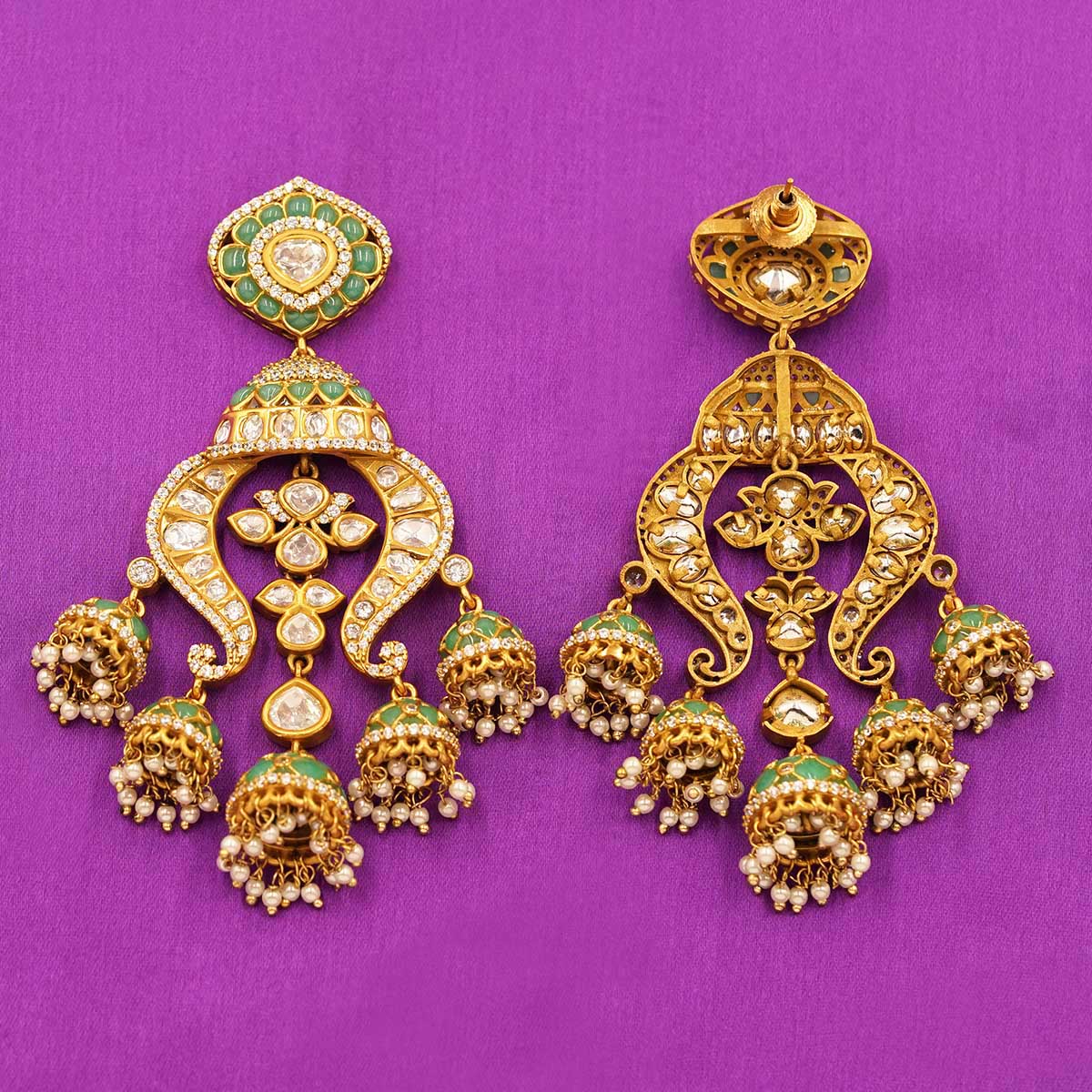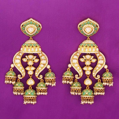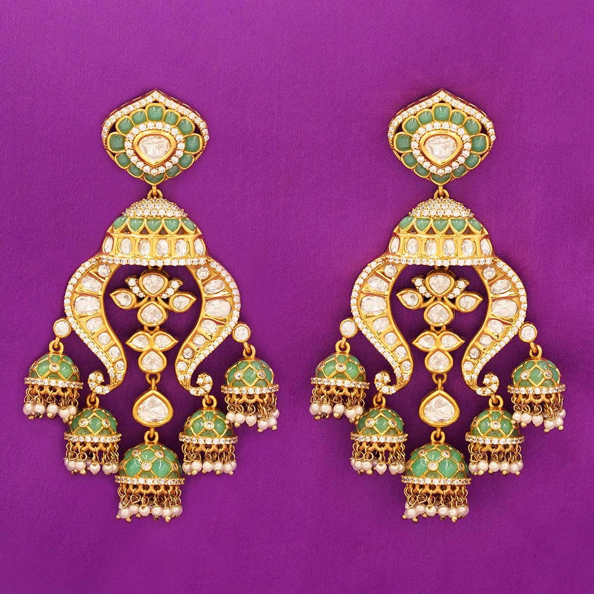 DESCRIPTION - These statement chandbali earrings feature stunning turquoise enamel paired with sparkling Kundan stones for an elegant royal look. The multi-jhumka danglers add perfect festive movement and charm. Ideal for weddings, parties, and traditional outfits.