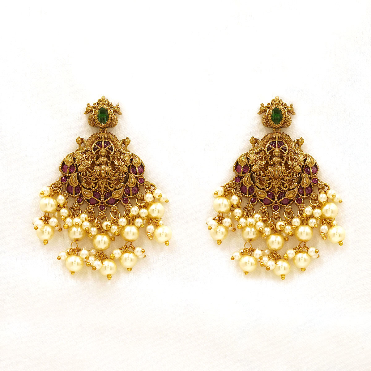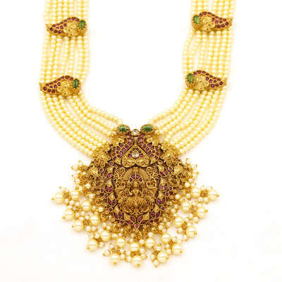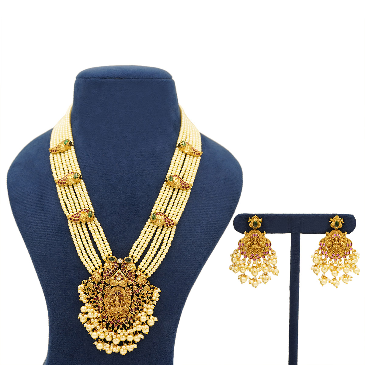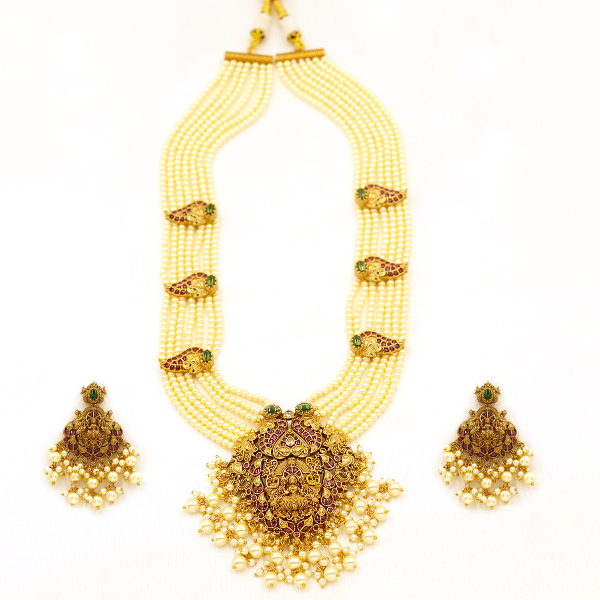DESCRIPTION - ELEVATE YOUR TRADITIONAL LOOK WITH THIS EXQUISITE MULTI-STRING PEARL TEMPLE NECKLACE SET, DESIGNED WITH RICH ANTIQUE GOLD DETAILING AND INTRICATE RUBY-GREEN STONE ACCENTS. THE LAYERED PEARL STRANDS ARE ADORNED WITH ORNATE TEMPLE-STYLE MOTIFS, LEADING TO A GRAND HANDCRAFTED PENDANT THAT REFLECTS TIMELESS SOUTH INDIAN ARTISTRY. PAIRED WITH MATCHING JHUMKA-STYLE EARRINGS EMBELLISHED WITH PEARLS, THIS SET IS PERFECT FOR WEDDINGS, FESTIVE CELEBRATIONS, AND CLASSICAL OCCASIONS. A STATEMENT PIECE THAT BEAUTIFULLY BLENDS HERITAGE CHARM WITH REGAL ELEGANCE.