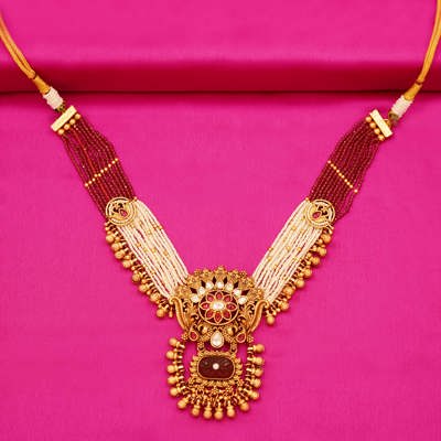 DESCRIPTION - Step into timeless elegance with this Antique Rajwadi Moti Haar Set, inspired by Jaipur’s royal heritage. Designed with layered pearl strands and a bold pendant featuring intricate kundan work and a striking red stone centerpiece, this necklace radiates regal charm. The set is completed with matching statement earrings, making it the perfect choice for weddings, bridal wear, festive functions, and traditional occasions.