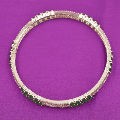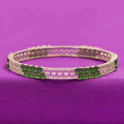 DESCRIPTION - A beautifully crafted bangle pair featuring bright green oval stones arranged in a delicate floral pattern. The sparkling accent stones enhance the green stones, while the gold-finish base adds a rich and traditional charm. Lightweight, stylish, and perfect for festive wear, weddings, and ethnic outfits — this pair brings a graceful pop of green to your collection.