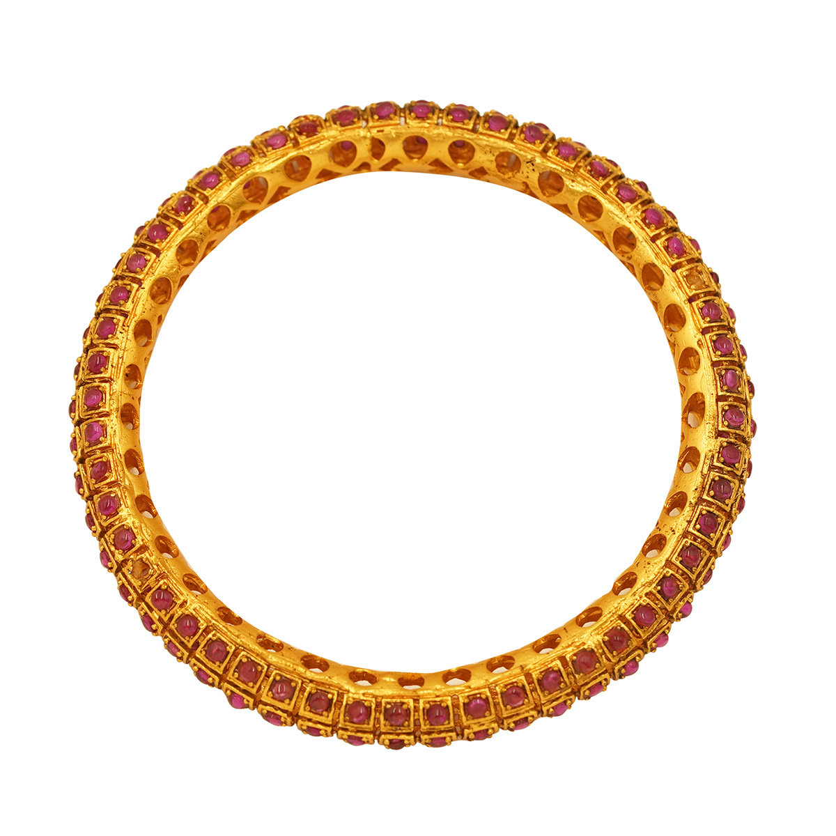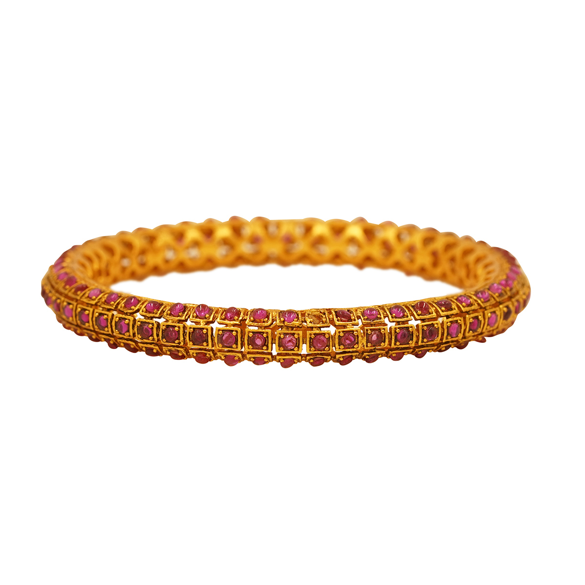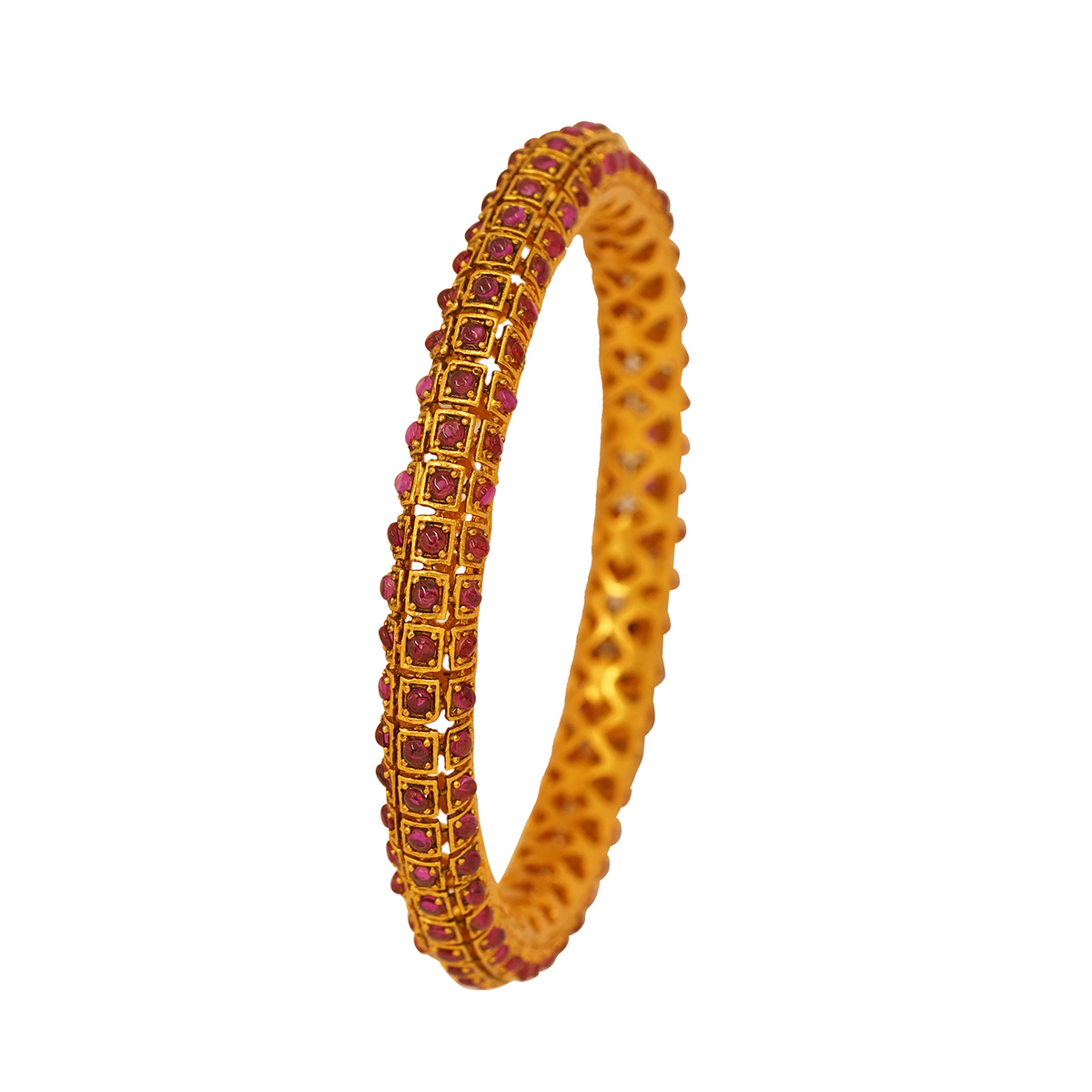 DESCRIPTION - THESE ELEGANT GOLD TONE BANGLES FEATURE A CAPTIVATING FLORAL MESH DESIGN ADORNED WITH RICH RUBY-TONED STONES. THE DELICATE OPENWORK PATTERN BRINGS A GRACEFUL VINTAGE CHARM, WHILE THE VIBRANT STONES ADD A LUXURIOUS BURST OF COLOR. LIGHTWEIGHT YET INTRICATELY CRAFTED, THESE BANGLES ARE PERFECT FOR WEDDINGS, TRADITIONAL CEREMONIES, AND FESTIVE STYLING. THEIR TIMELESS APPEAL MAKES THEM A CHERISHED ADDITION TO ANY JEWELLERY COLLECTION.