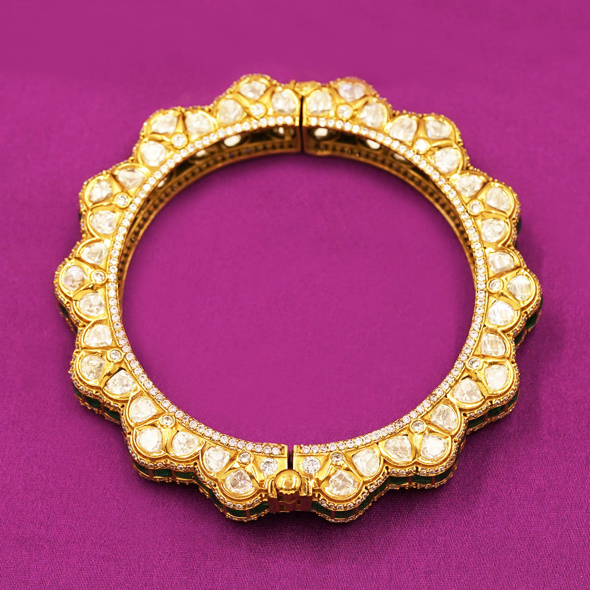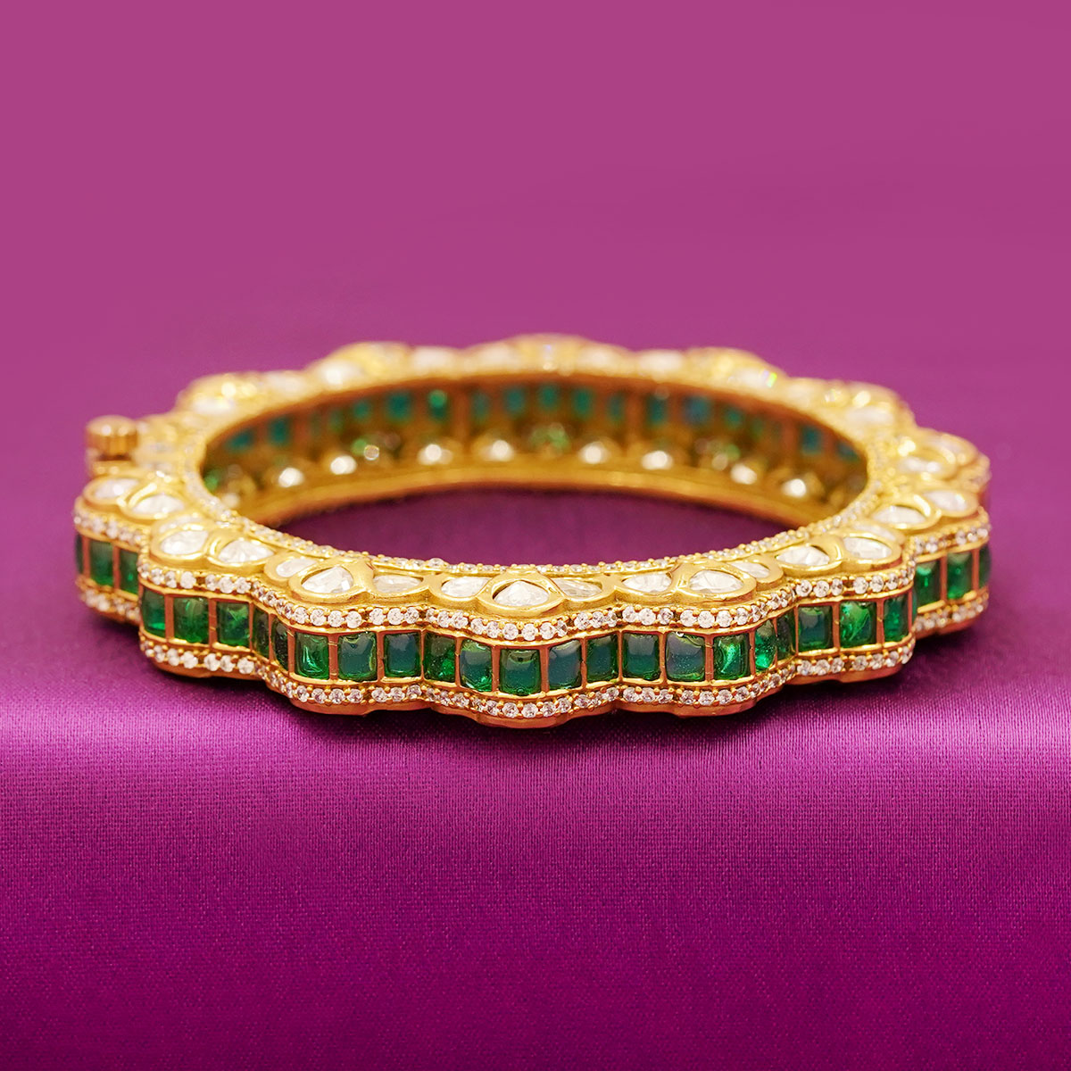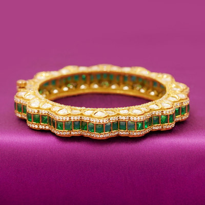 DESCRIPTION - This exquisite bangle features a luxurious combination of emerald-green square stones and premium Polki-style stones, set in a beautifully crafted scallop-edge gold-finish design. The alternating pattern of green stones on the outer edges and Polki stones on the inner curve creates a stunning double-layer look, adding brilliance and depth to the piece.