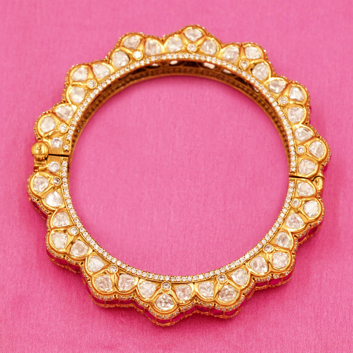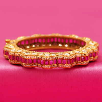 DESCRIPTION - This stunning designer bangle features a continuous row of square-cut ruby-red stones, beautifully set in a luxurious gold-finish frame. The dual-layered border of shimmering micro-stones adds extra brilliance, giving the bangle a rich and regal appearance.