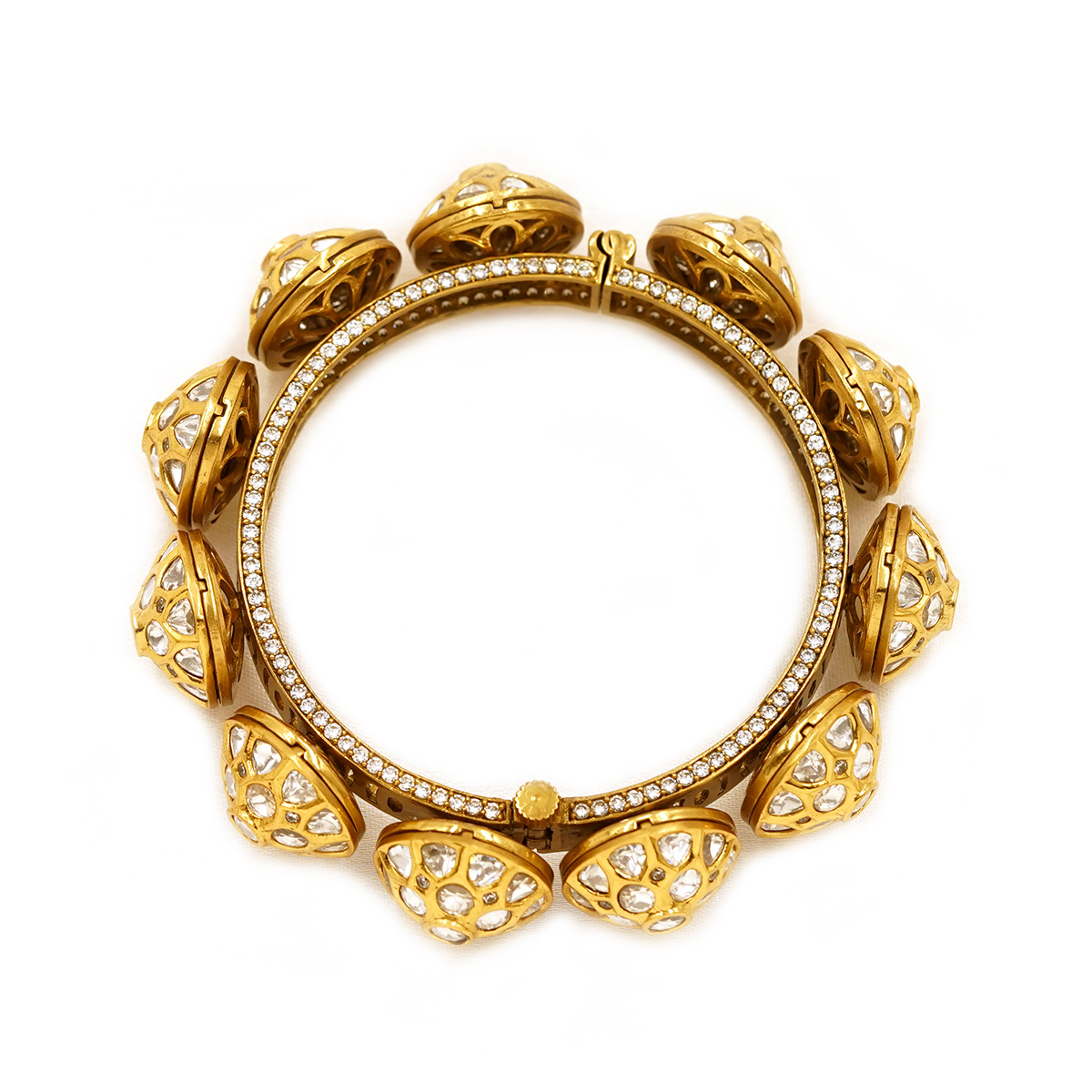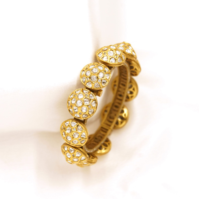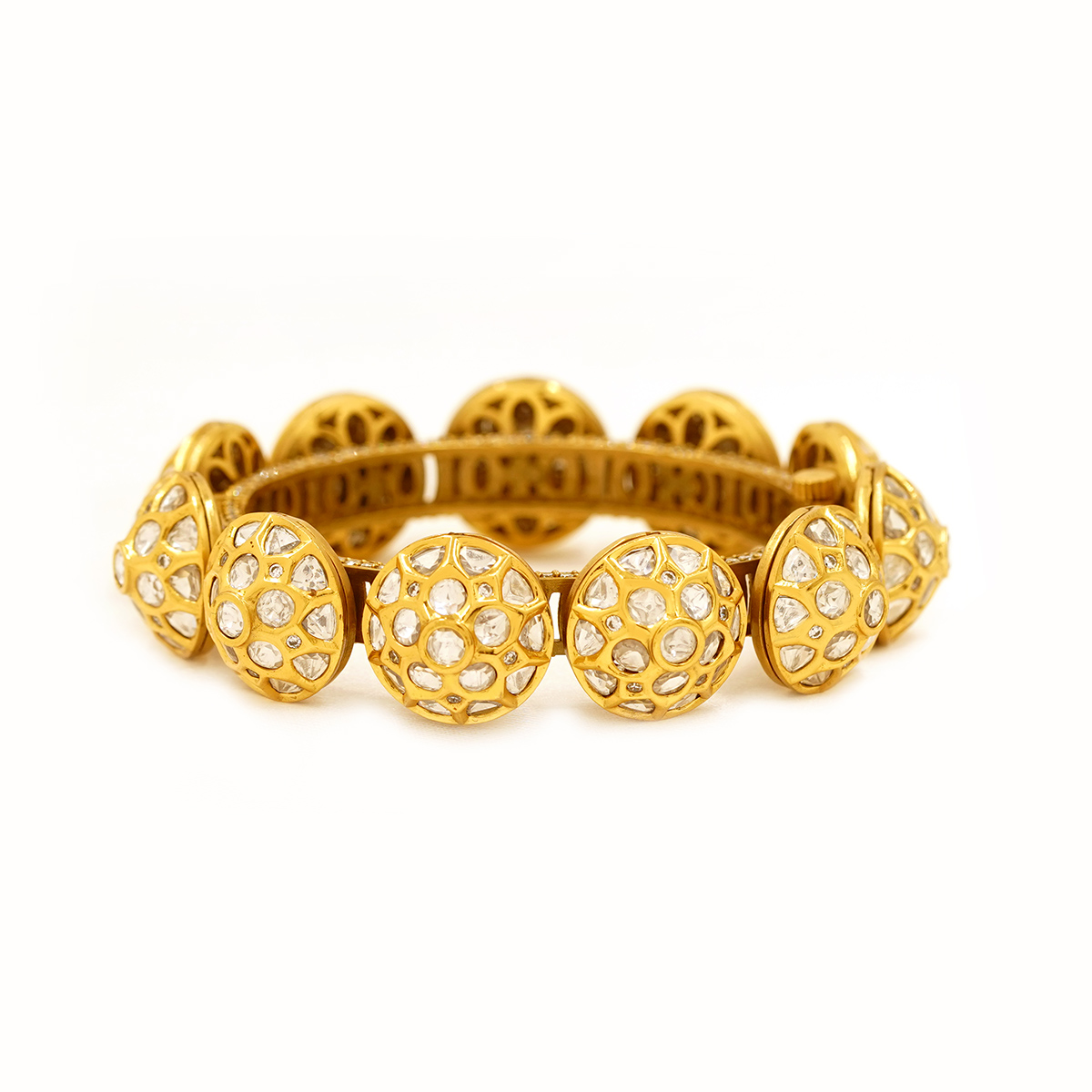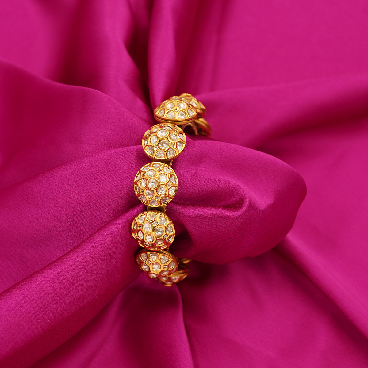 DESCRIPTION - THIS ELEGANT GOLD TONE BANGLE SHOWCASES A TIMELESS TRADITIONAL DESIGN WITH BEAUTIFULLY CRAFTED CIRCULAR FILIGREE MOTIFS. EACH SEGMENT IS INTRICATELY DETAILED TO REFLECT LIGHT FROM EVERY ANGLE, CREATING A RICH AND RADIANT FINISH. PERFECT FOR WEDDINGS, FESTIVE OCCASIONS, AND SPECIAL CELEBRATIONS, THIS BANGLE ADDS A TOUCH OF HERITAGE CHARM AND SOPHISTICATION TO ANY ATTIRE. A CLASSIC PIECE THAT BLENDS ARTISTRY WITH LUXURY, MAKING IT AN IDEAL ADDITION TO YOUR JEWELRY COLLECTION OR A THOUGHTFUL GIFT FOR SOMEONE SPECIAL.