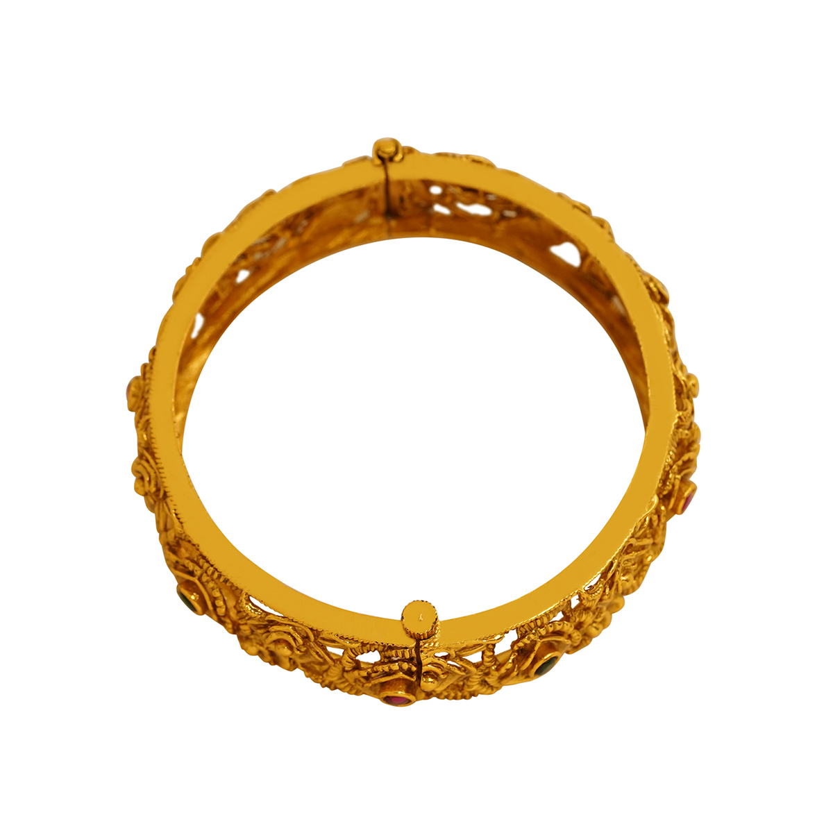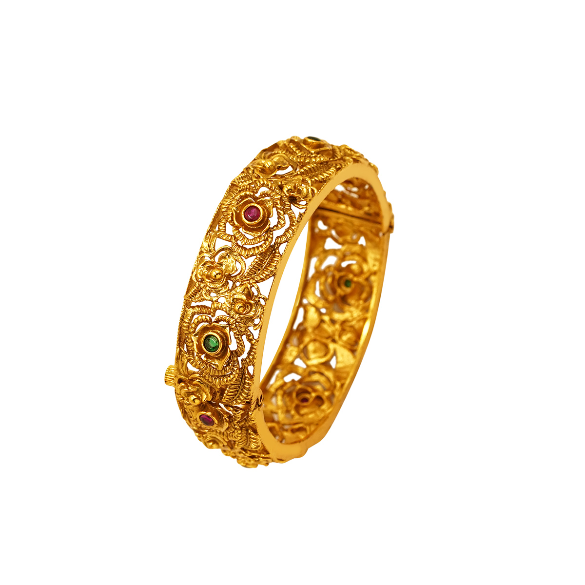 DESCRIPTION - THE ELEGANT BANGLES ARE FEATURING AN INTRICATE TRADITIONAL INDIAN DESIGN. THEY HAVE AN ANTIQUE OR MATTE FINISH AND ARE EMBELLISHED WITH SMALL RED AND GREEN STONES, LIKELY RUBIES AND EMERALDS OR THEIR CUBIC ZIRCONIA (CZ) SIMULANTS. THE DESIGN INCORPORATES DETAILED FLORAL OR LATTICE CUTWORK MOTIFS.