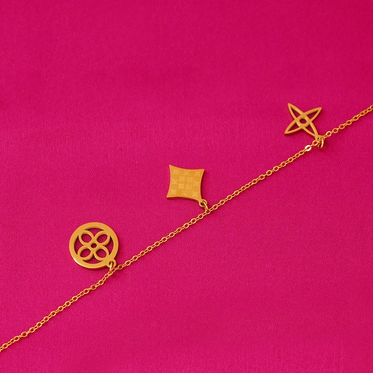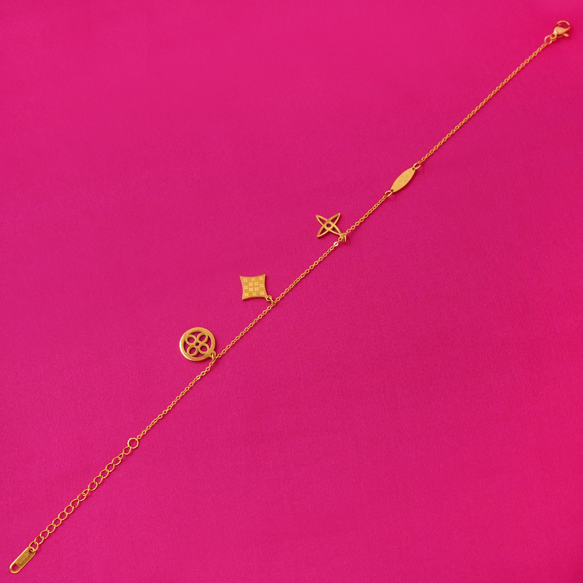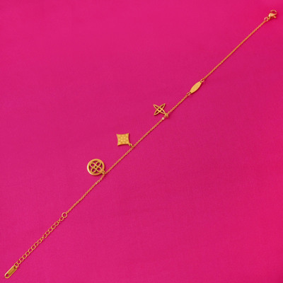 DESCRIPTION - Step up your everyday elegance with this Golden Charm Bracelet, designed with delicate star and geometric motifs enhanced by a touch of red enamel detail. The minimalist yet striking design adds a stylish charm to any outfit — perfect for casual wear, office looks, or gifting.