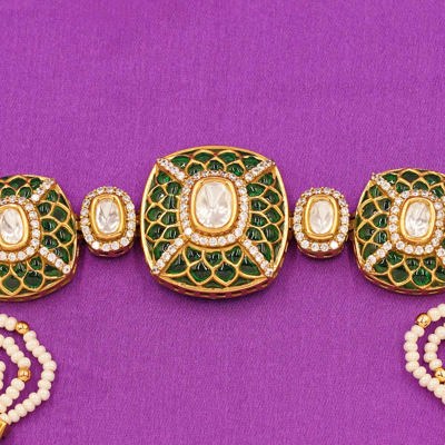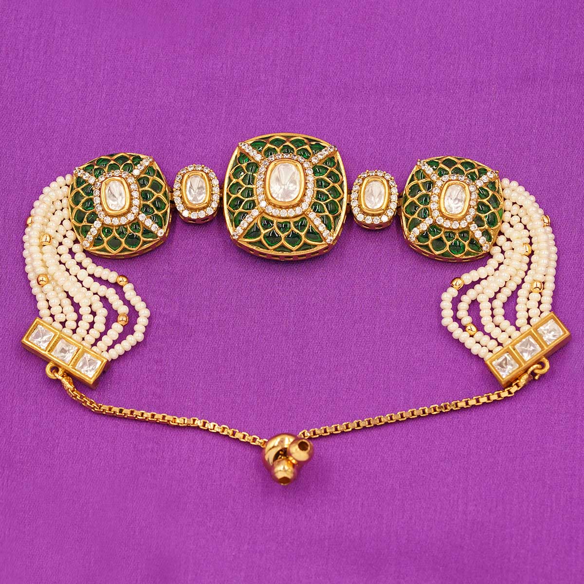 DESCRIPTION - This luxurious bracelet showcases a majestic set of emerald green Kundan panels, each crafted with a royal floral jaal design and a sparkling central stone. Ideal for brides and festive occasions, this statement piece beautifully complements lehengas, sarees, and traditional outfits—adding unmatched grace and grandeur to your look.