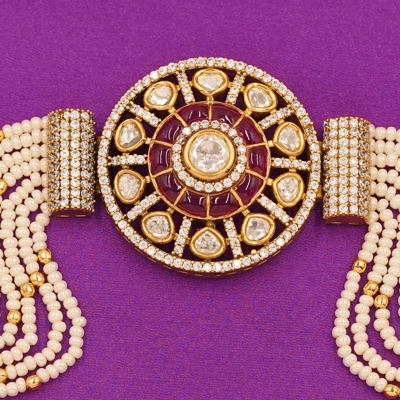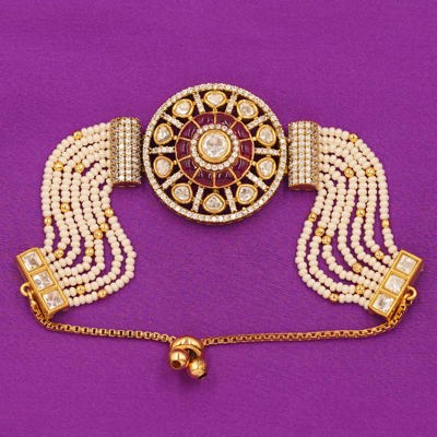 DESCRIPTION - This premium handcrafted bracelet features a grand circular ruby Kundan centerpiece surrounded by sparkling white stones in a stunning floral pattern. The multi-layer pearl strings enhance its luxurious and regal appeal, giving it a truly royal finish.