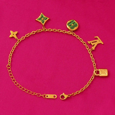 DESCRIPTION - Add a pop of elegance and color to your style with this Trendy Golden Bracelet with Green Enamel Charms. Featuring bold geometric motifs accented with glossy green enamel, this bracelet offers a perfect fusion of modern chic and timeless grace.