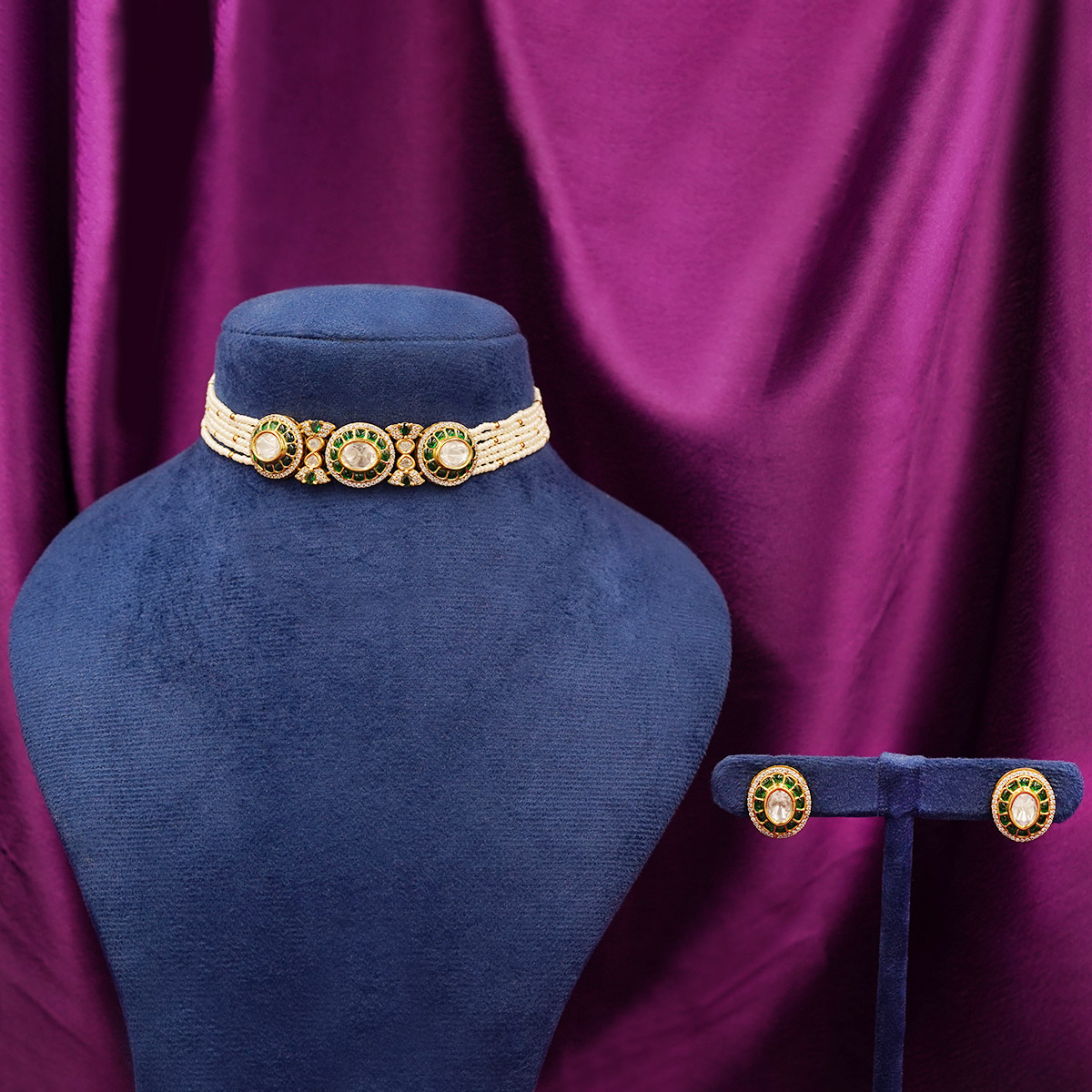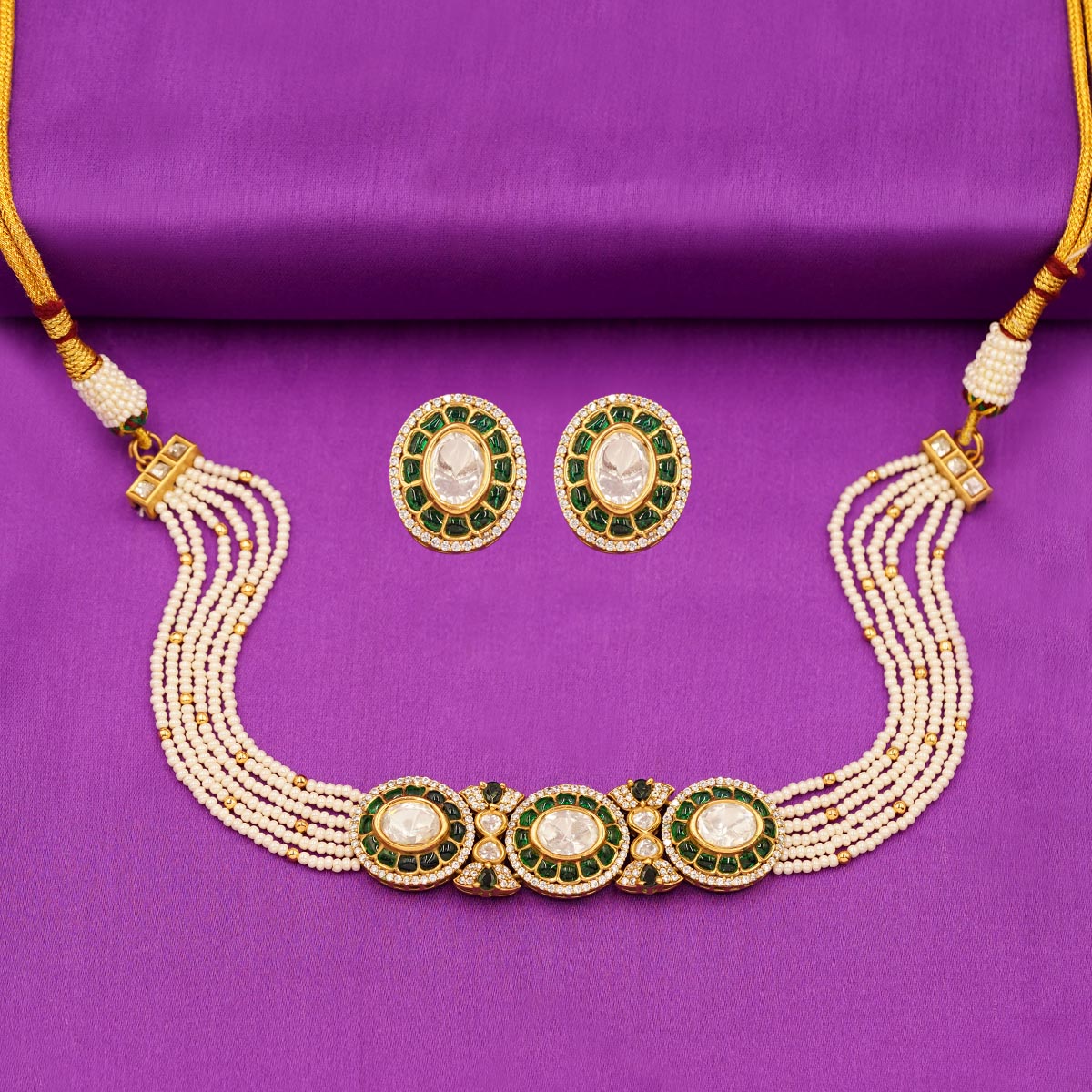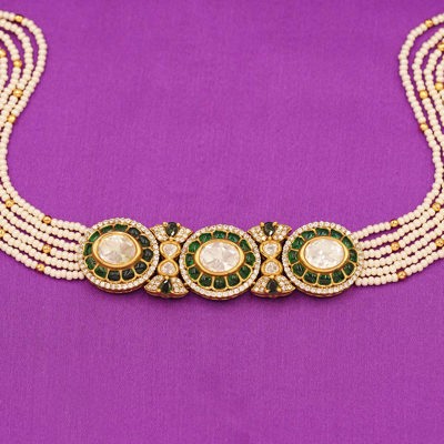 DESCRIPTION - This elegant choker-style necklace set features stunning green accents surrounded by intricate detailing and complemented with fine pearl strands. Ideal for festive occasions, cultural events, or elegant evening wear, this set adds a refined royal charm to your look.
