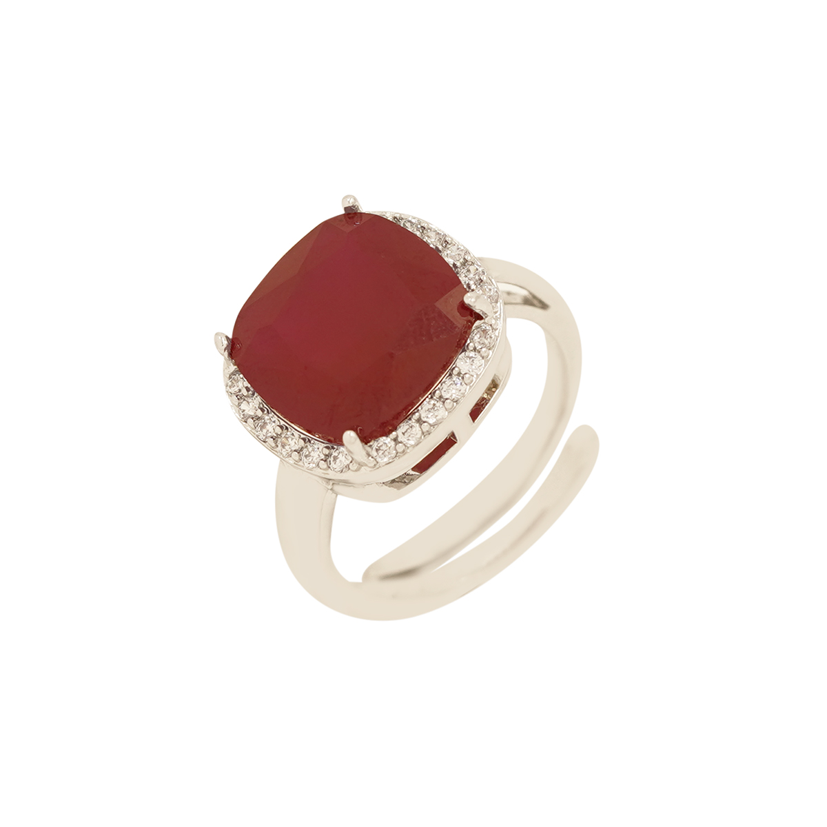 DESCRIPTION - A stunning cushion-cut ruby sits at the center, surrounded by a sparkling halo of shimmering stones. Its bold red hue adds a luxurious and timeless charm. Perfect for special occasions or statement wear.
