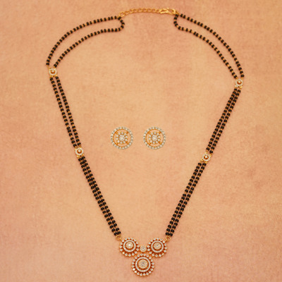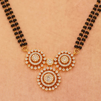 DESCRIPTION - This beautiful mangalsutra set features a trio of floral-inspired motifs adorned with shimmering stones on a traditional double black bead chain. A perfect blend of elegance and simplicity for everyday wear.