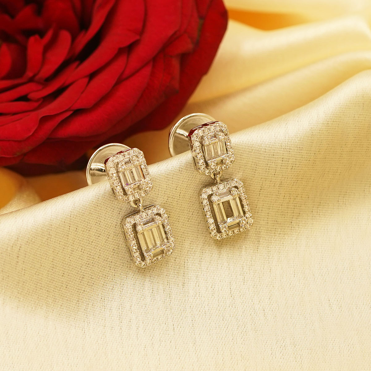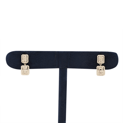 DESCRIPTION - ELEVATE YOUR ELEGANCE WITH THESE STUNNING DUAL-HALO DROP EARRINGS. EACH EARRING FEATURES TWO RADIANT SQUARE-CUT STONES FRAMED WITH SHIMMERING PAVÉ HALOS, CREATING A LUXURIOUS LAYERED EFFECT. THE GEOMETRIC DESIGN ADDS A MODERN TOUCH, WHILE THE SPARKLING STONES ENSURE TIMELESS GLAMOUR. PERFECT FOR WEDDINGS, PARTIES, OR EVENING WEAR, THESE EARRINGS BRING UNMATCHED BRILLIANCE TO EVERY LOOK.