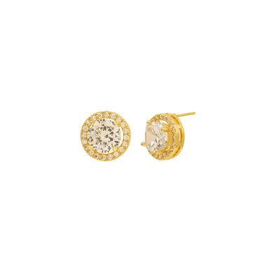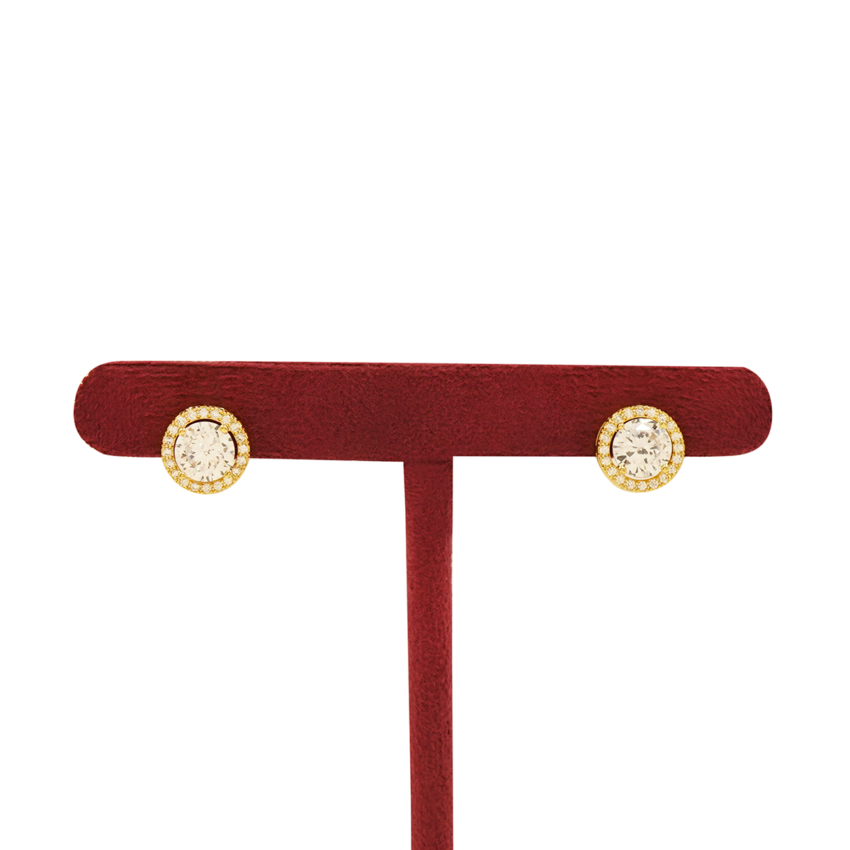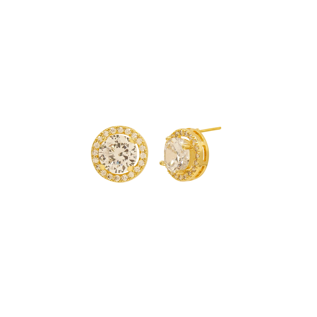 DESCRIPTION - These elegant round stud earrings feature a sparkling central stone surrounded by a shimmering halo of tiny crystals, giving them a timeless and luxurious look. The golden-toned finish adds warmth and sophistication, making them perfect for both daily wear and special occasions.