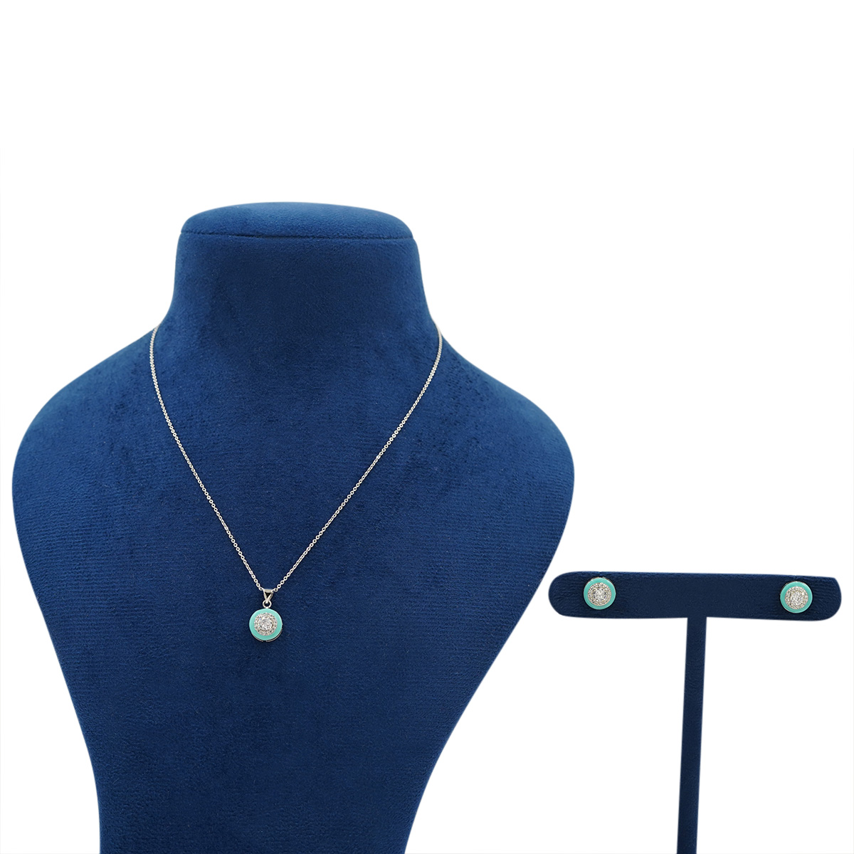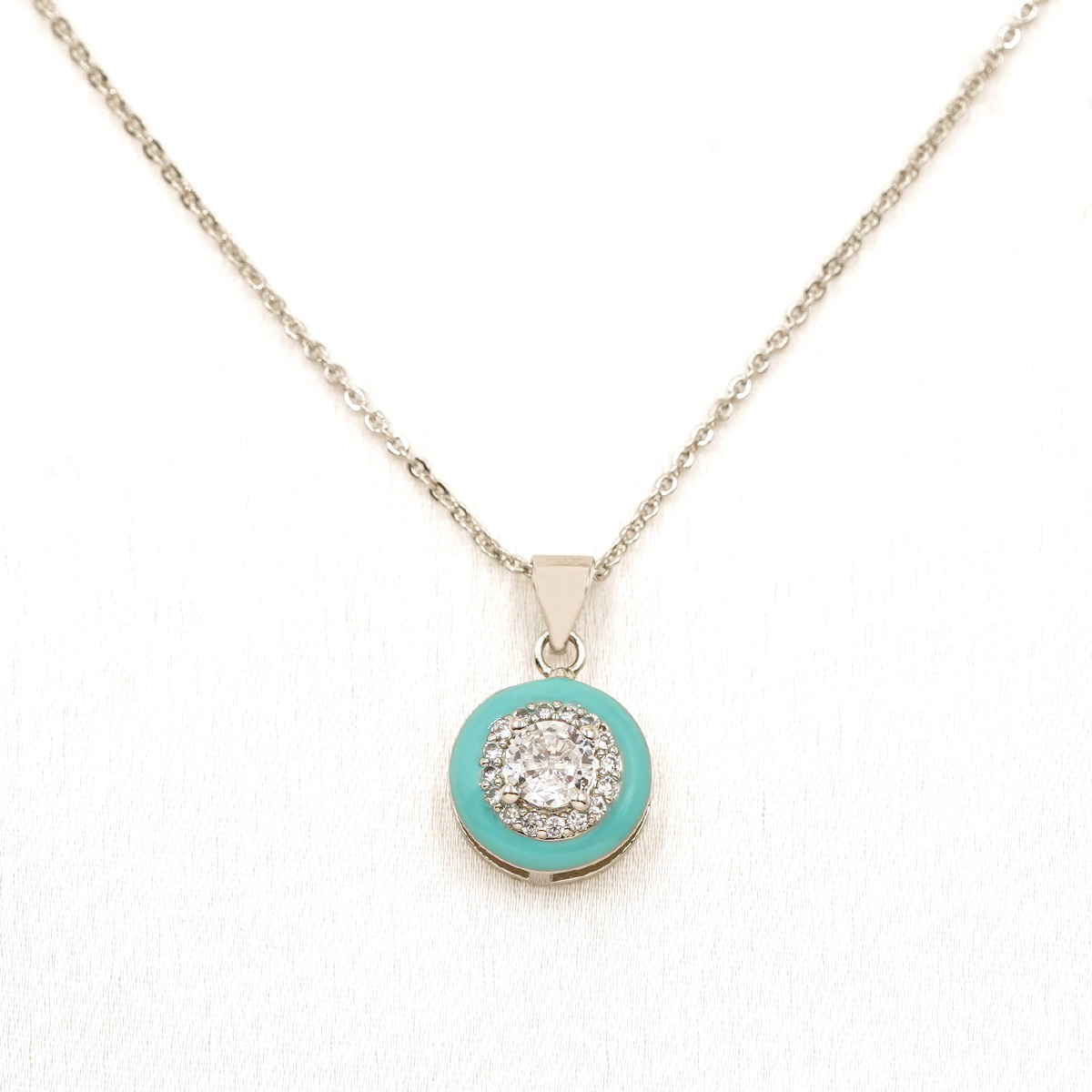 DESCRIPTION - ADD A TOUCH OF SERENE ELEGANCE TO YOUR COLLECTION WITH THIS GRACEFUL AQUA HALO PENDANT NECKLACE SET, PAIRED WITH MATCHING STUD EARRINGS. FEATURING SOFT AQUA-TONED STONES ENCIRCLED BY SPARKLING CRYSTAL ACCENTS, THIS SET OFFERS A PERFECT BALANCE OF SUBTLE COLOR AND REFINED SHINE. THE DELICATE SILVER-TONED CHAIN ENHANCES THE PENDANT’S CHARM, MAKING IT IDEAL FOR EVERYDAY ELEGANCE AS WELL AS SPECIAL OCCASIONS. A TIMELESS CHOICE FOR GIFTING OR ELEVATING YOUR OWN JEWELRY WARDROBE WITH EFFORTLESS SOPHISTICATION.