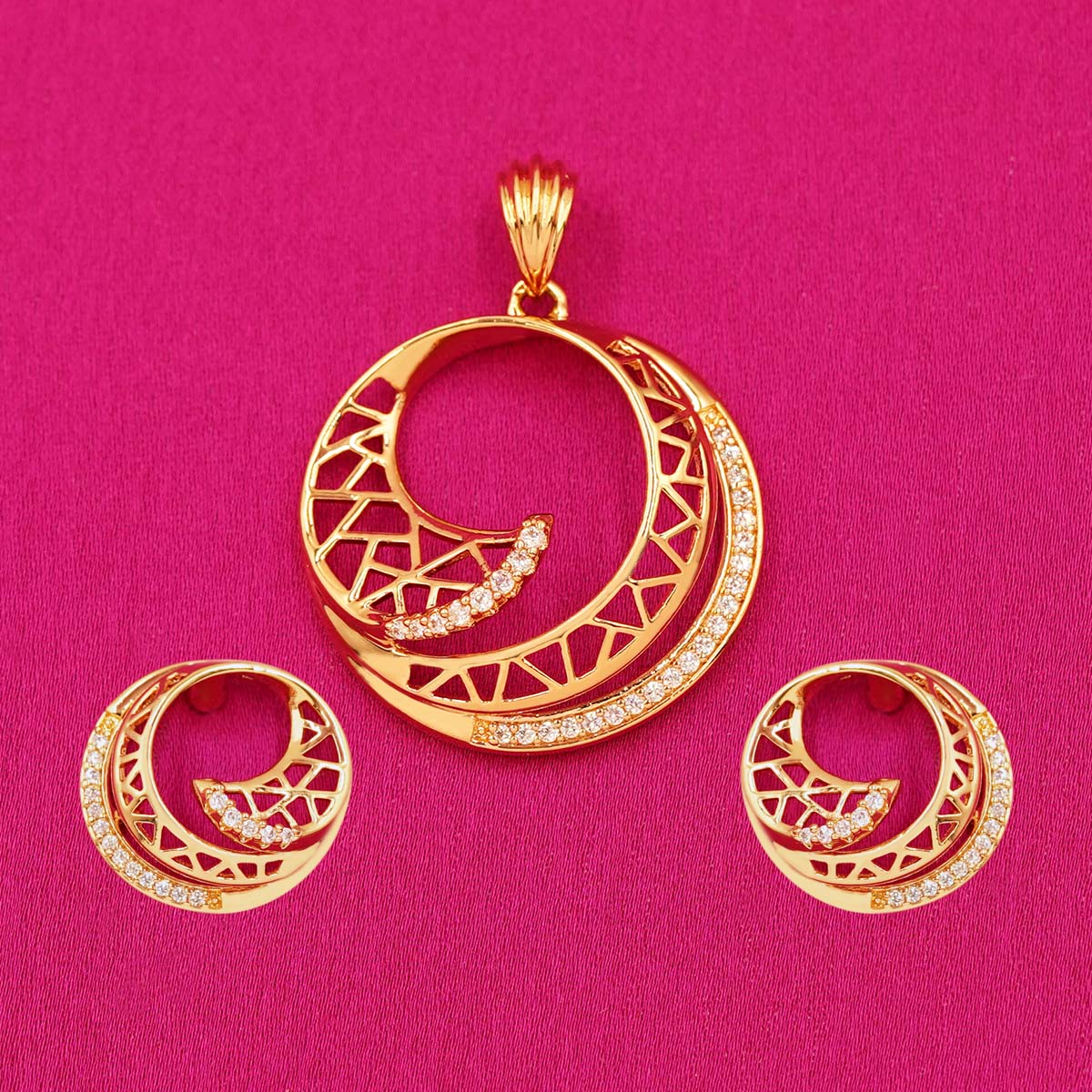 DESCRIPTION - This stunning pendant set features a modern circular pattern with delicate lattice detailing and shimmering stone accents. Designed for timeless elegance, it adds a sophisticated charm to any outfit