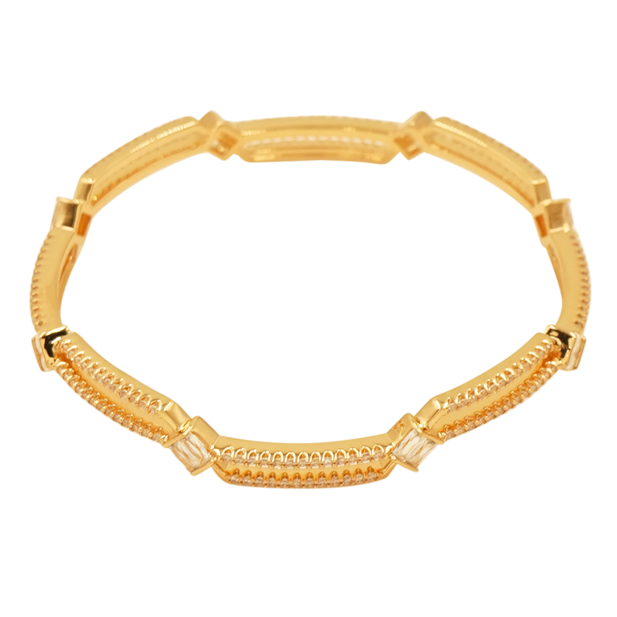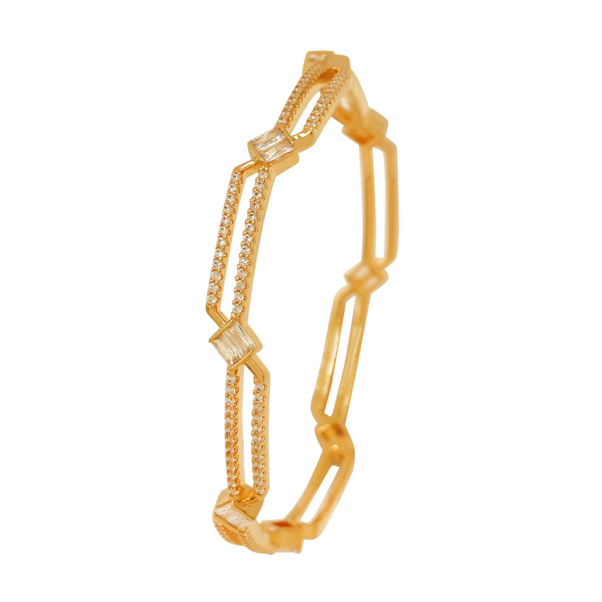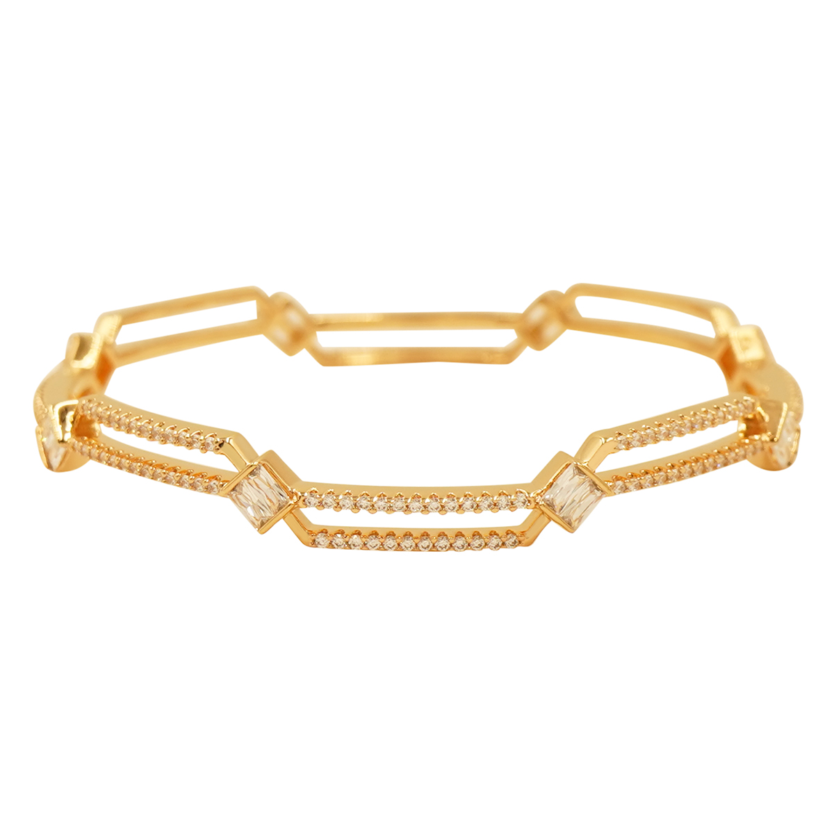 DESCRIPTION - This beautiful bangle pair features a unique geometric cutwork design accented with sparkling stones for a refined and modern look. Crafted in a premium gold-tone finish, these bangles offer lightweight comfort and stylish elegance. Perfect for festive wear, parties, and everyday styling, this pair adds a classy and sophisticated touch to any outfit.